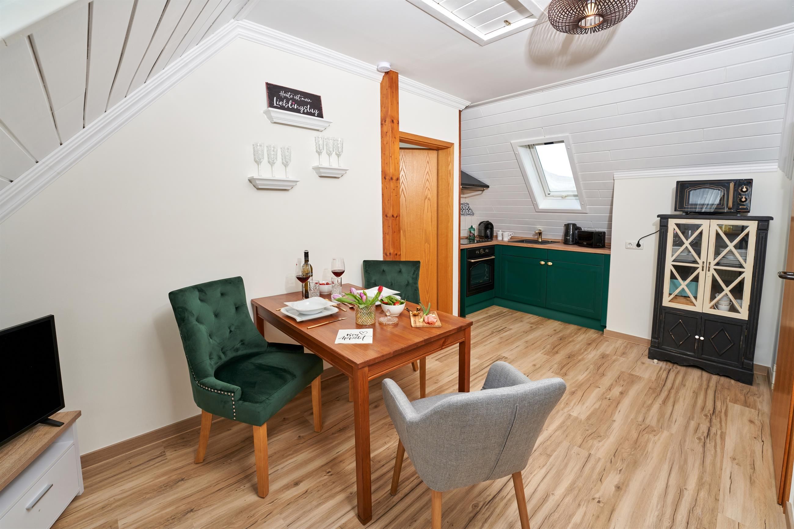 Vous habitez soit dans le salon du maar, directement sous les toits avec vue sur le maar depuis les lucarnes, soit dans le salon du château en contrebas, où vous pouvez ressentir le charme des chevaliers dans un intérieur confortable et rustique, ou dans le petit studio, le salon de la galerie, qui se trouve au rez-de-chaussée et a une touche très particulière grâce à son mur arrière.