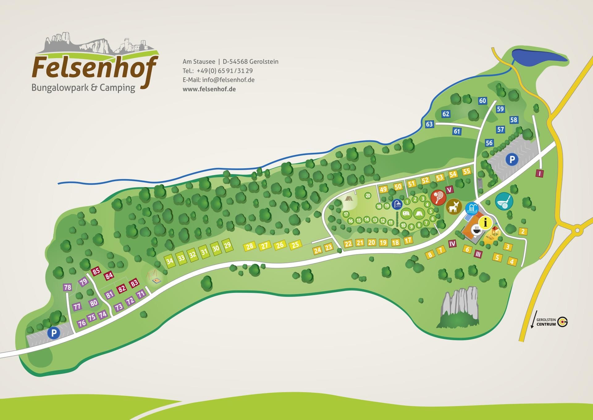 Surface de parc d'environ 7,5 ha avec 65 bungalows indépendants et 20 emplacements de camping.
