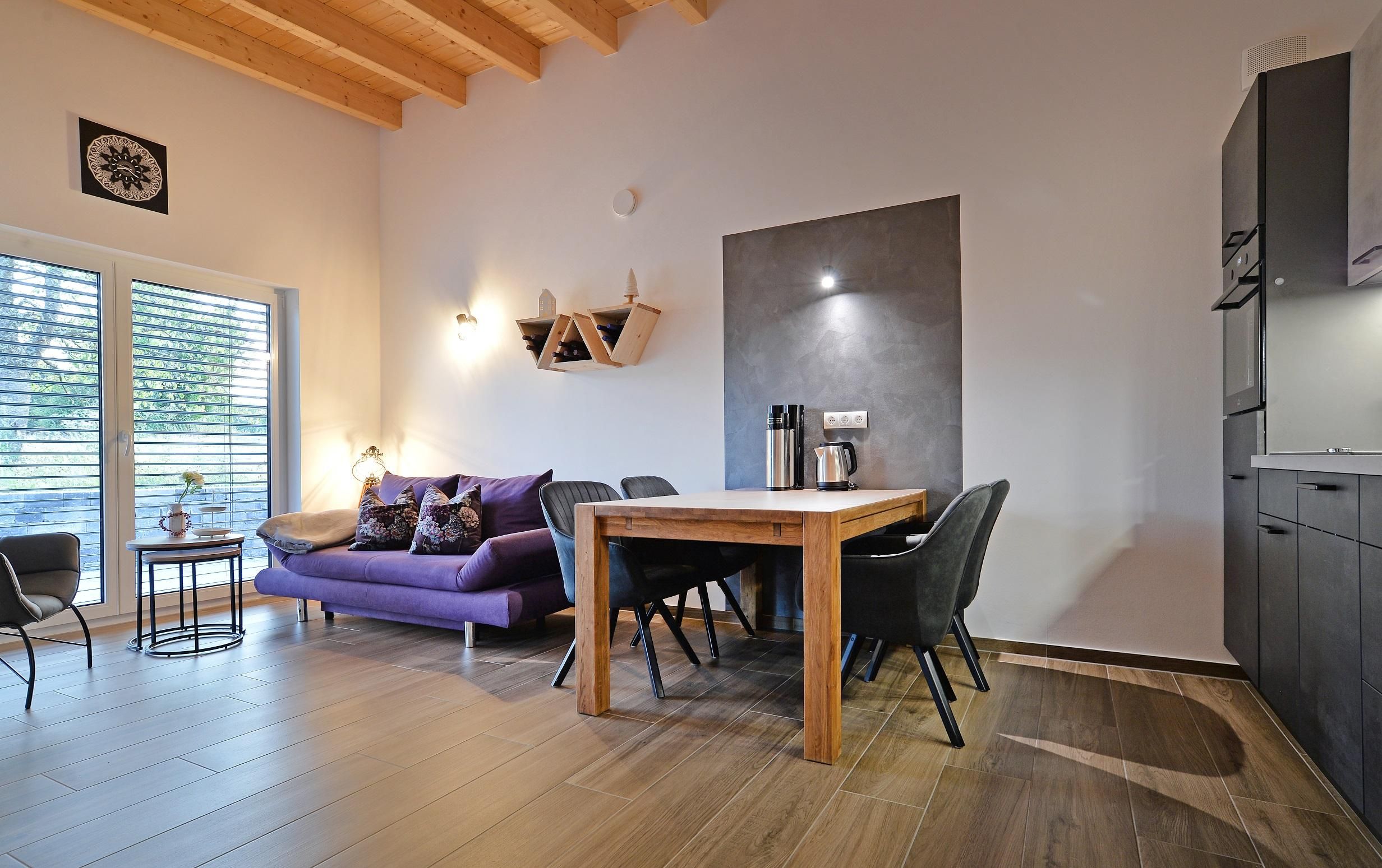 Nos maisons de vacances disposent chacune d'une chambre double, d'une chambre individuelle, d'une salle de bain spacieuse avec cabine infrarouge et d'un salon ouvert avec cuisine. La terrasse spacieuse a un accès direct depuis le salon, mais aussi depuis la chambre à coucher. Si nécessaire, la terrasse est protégée du vent et de la pluie sur trois côtés et peut donc être utilisée même lors des fraîches journées d'automne. Quand il fait chaud, vous pouvez ouvrir la paroi vitrée mobile. Les fenêtres sont équipées d'une moustiquaire. Dans la buanderie commune, une machine à laver et un sèche-linge sont mis gratuitement à disposition pour chaque maison de vacances. Vos vélos sont en sécurité dans le garage à vélos verrouillable. Il y a six prises de courant pour les chargeurs de vos vélos et suffisamment de surfaces de rangement. Si nécessaire, vous pouvez y attacher vos vélos.