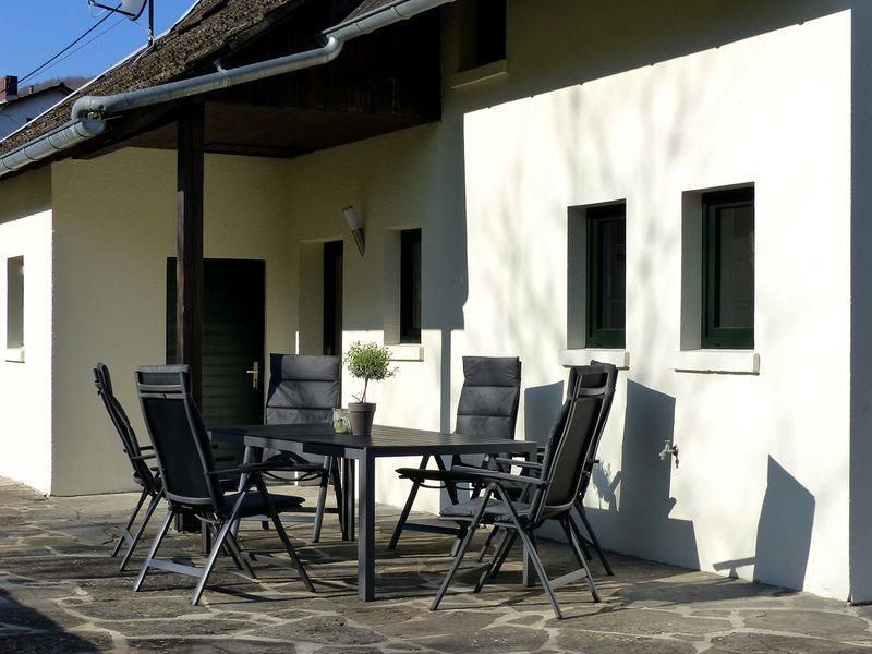 • Un espace extérieur confortable avec une table et plusieurs chaises. Le mur de la maison est clair et les fenêtres sont conçues dans une teinte plus foncée.