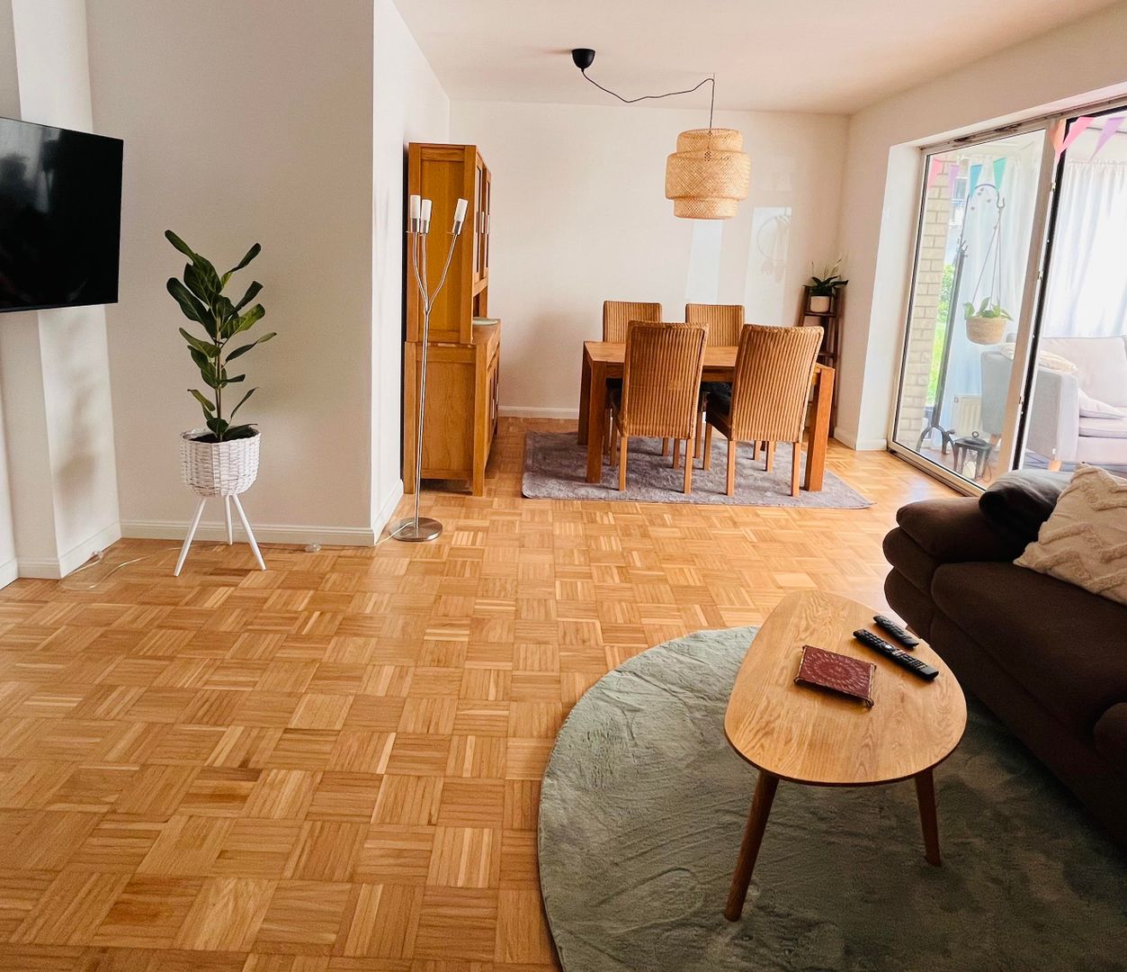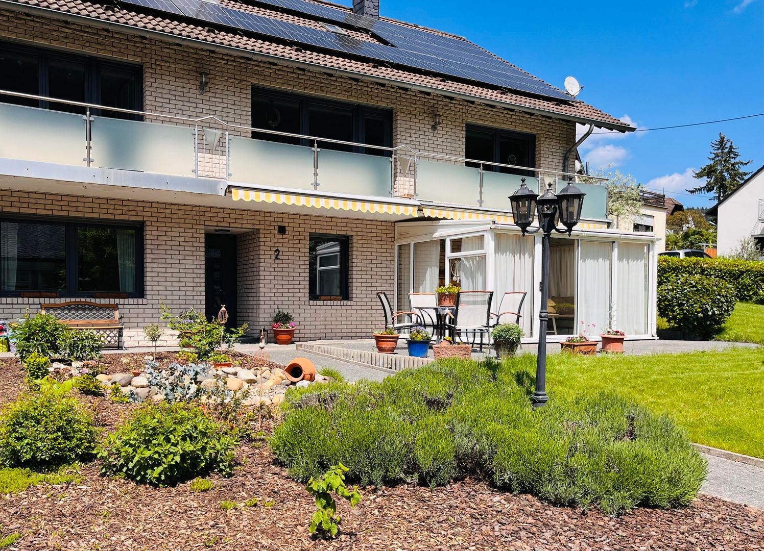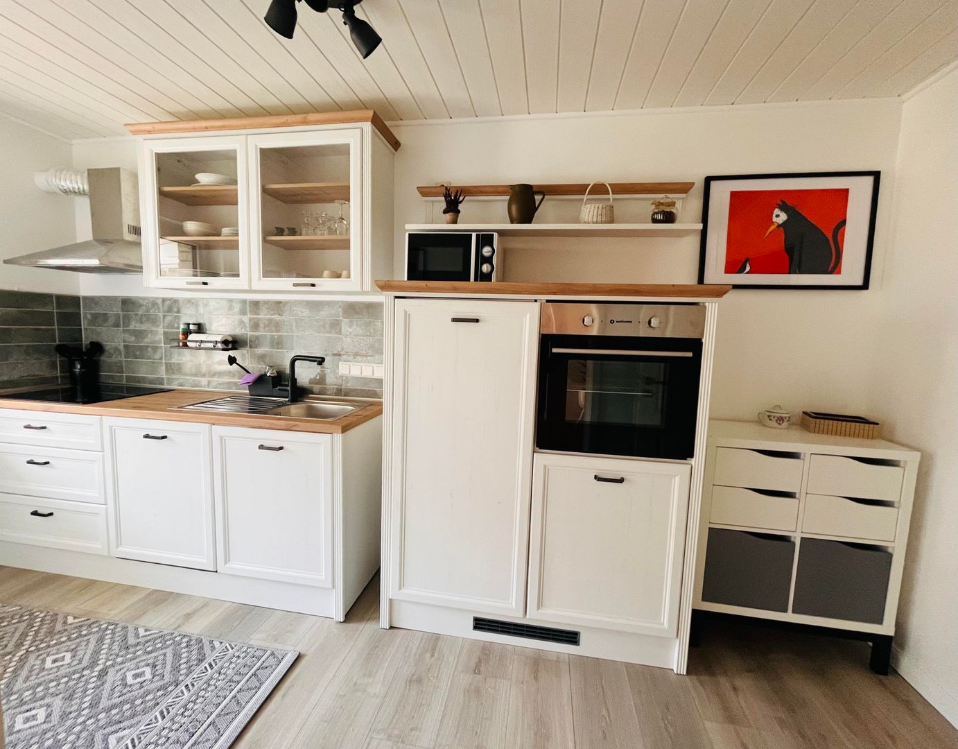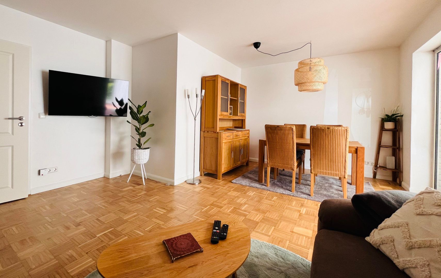 La cuisine est équipée d'un four, d'une cuisinière, d'un réfrigérateur, d'un micro-onde, d'un lave-vaisselle, d'une machine à café et d'un toaster. Dans le grand salon et salle à manger, il y a une table qui peut accueillir jusqu'à quatre personnes. La télévision dispose d'Amazon-Prime et de Magenta-TV. Bien entendu, le wifi est disponible dans toutes les chambres.