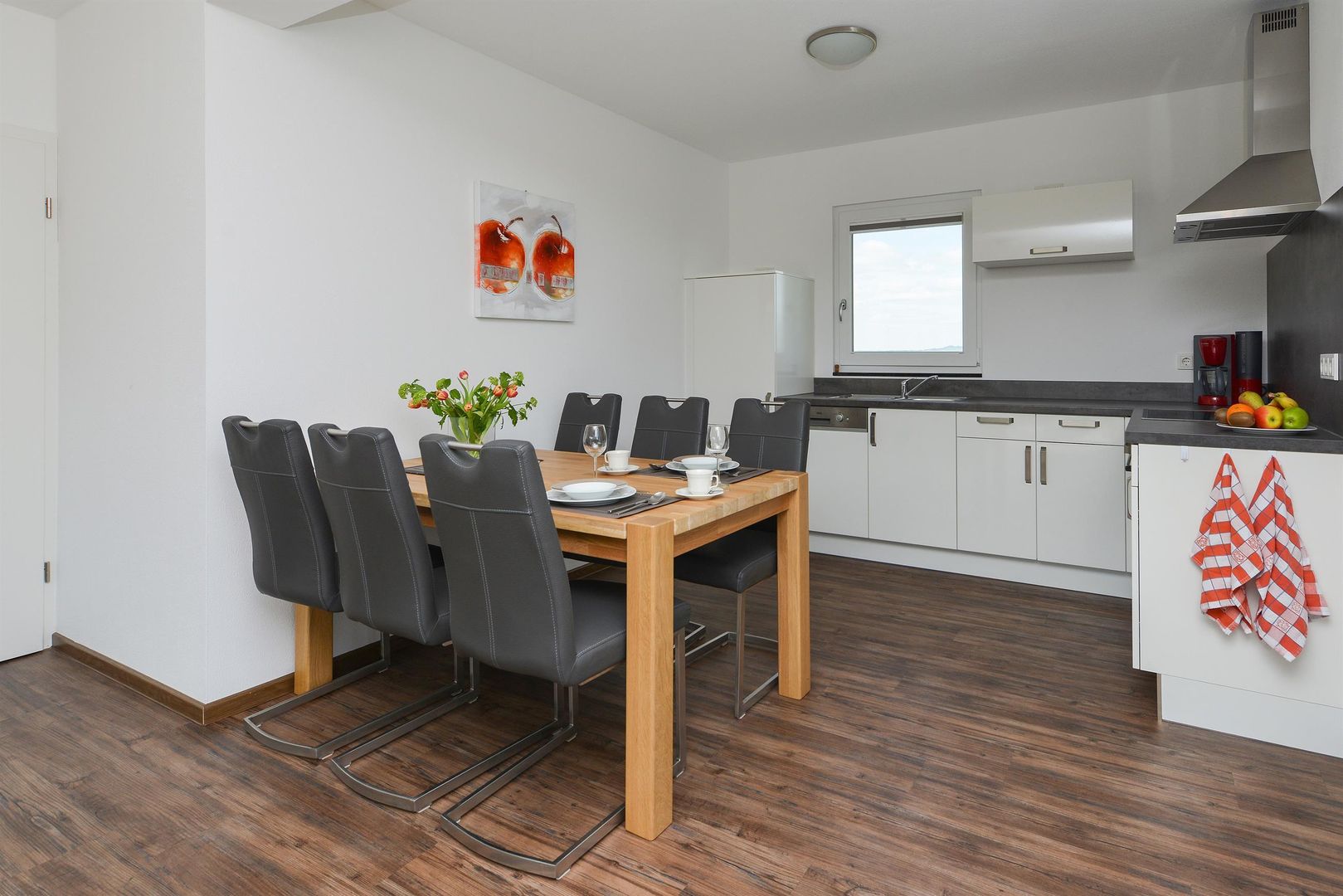 Cuisinière électrique, lave-vaisselle, four, micro-ondes, réfrigérateur/congélateur, cafetière, bouilloire, serviettes de cuisine, rouleau de papier de cuisine, liquide vaisselle