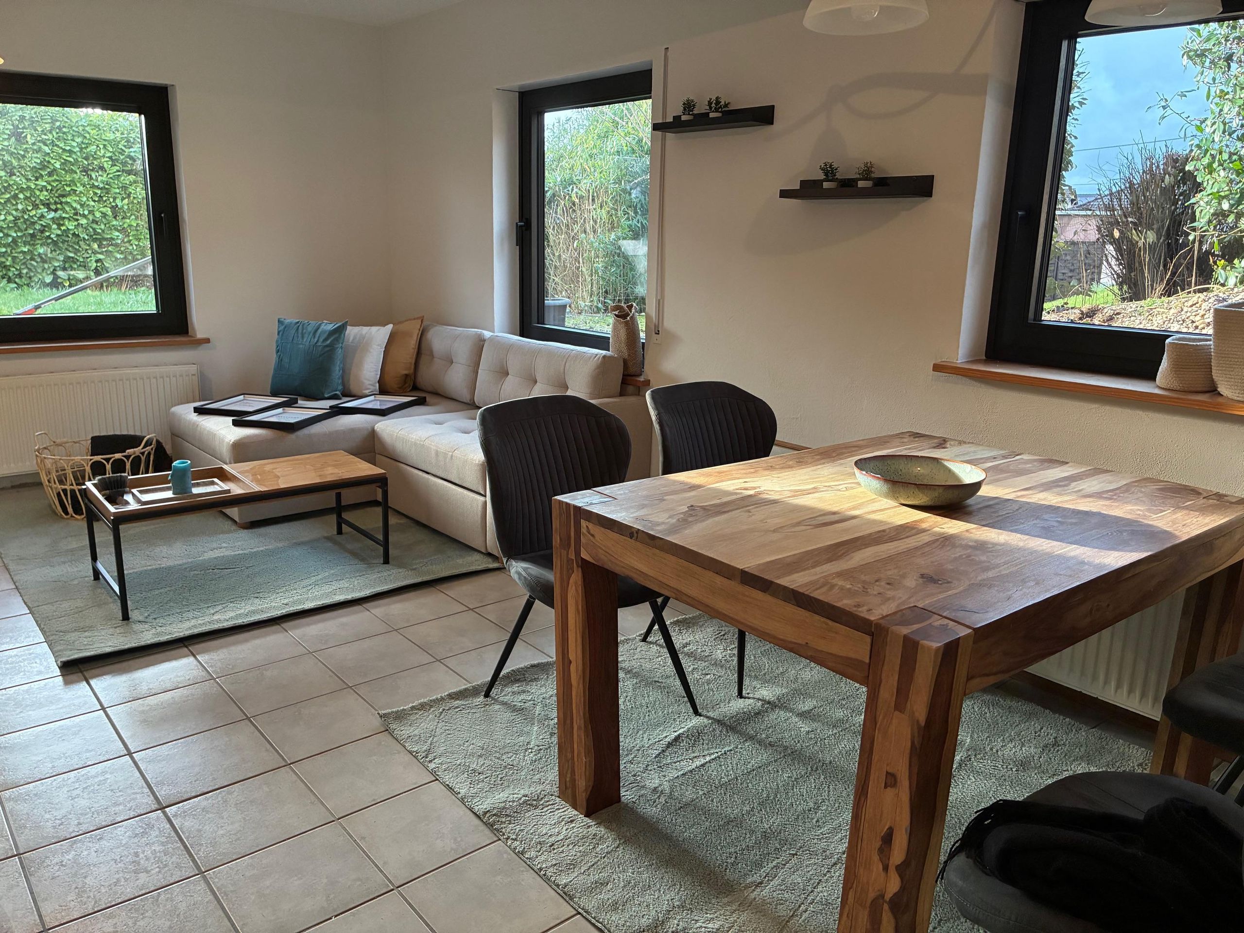 Voyager & arriver dans l'Eifel volcanique - dans le ZEITquartierComme l'Eifel offre des vacances très variées, que ce soit de manière active (randonnées, vélo) ou pour ralentir (promenades relaxantes), vous pouvez me louer, une ancienne maison de l'Eifel (entièrement rénovée en 2021). Mes hôtes de 1 à 3 personnes maximum me trouveront comme appartement de vacances - un espace de bien-être de 85 m² sur deux niveaux ouverts.Le terrain est entièrement clôturé et convient donc pour des vacances avec un chien.Je suis bien équipé, moderne et très confortable. Je dispose en outre d'une terrasse de jardin privée. Les vélos trouveront refuge dans mon abri de jardin. Depuis 150 ans, je vis sur le volcan Ringseiter à Kirchweiler. C'est un petit village dans le "GesundLand Vulkaneifel". (Daun à environ 8,0 km, Gerolstein à environ 7,0 km).Niveau du rez-de-chaussée Le rez-de-chaussée tient à disposition un petit couloir avec vestiaire et un coffre à bagages séparé. La cuisine ouverte et moderne est équipée d'un lave-vaisselle, d'une plaque vitrocéramique, d'un four, d'une machine à café, d'un grille-pain et bien d'autres choses encore, et offre un coin repas avec 4 chaises.Dans le salon, vous trouverez un fauteuil-lit dépliant sur lequel vous pourrez passer des heures agréables devant le poêle à bois (Bullerjahn).La salle de bain est équipée d'un lavabo, d'une douche, d'un WC et d'un sèche-cheveux.Niveau des comblesVaste espace de vie avec canapé, fauteuil TV, tabouret, table ronde avec chaises, armoire, étagère, lit boxspring (1,60 m de large), lucarne avec stores pare-soleil.