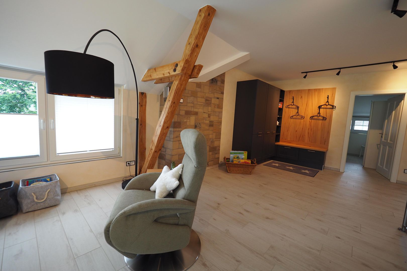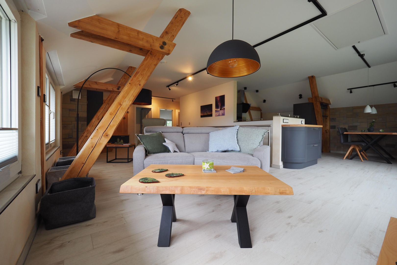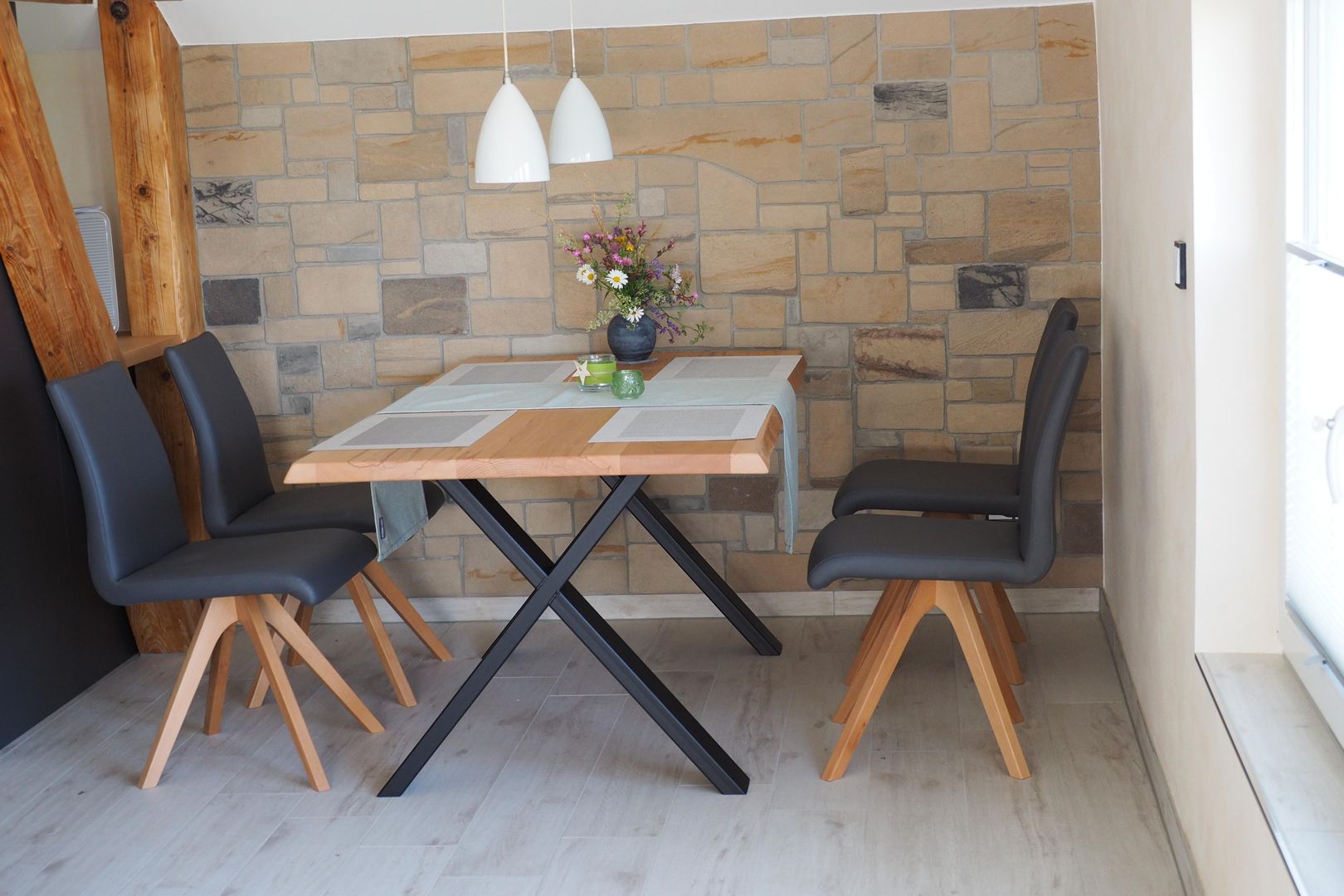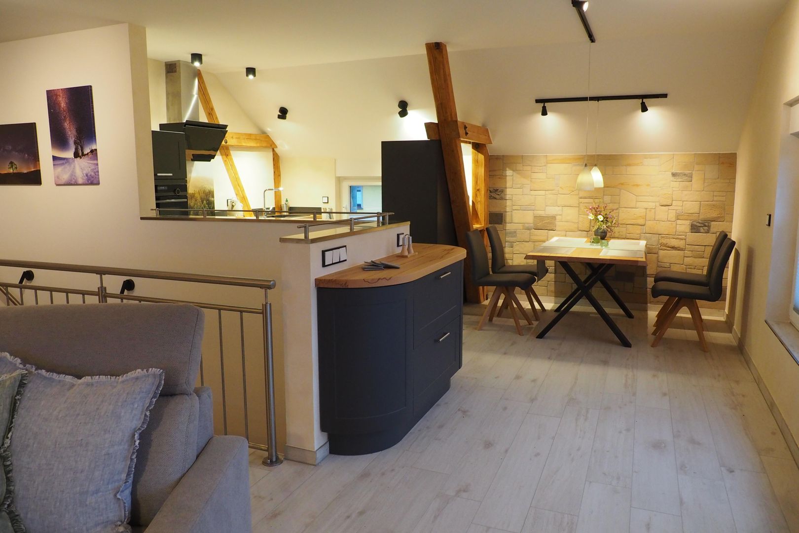 Lors de la transformation de l'ancienne étable et du grenier à foin en 2020/21, la grande pièce au premier étage a pu être conservée en grande partie, tout comme les anciens poteaux de toit. Un escalier facile à emprunter mène à la garde-robe et de là au coin lecture avec fauteuil de relaxation et au salon avec une vue fascinante sur le paysage et, la nuit, sur le ciel étoilé. La cuisine moderne entièrement équipée fera battre votre cœur - il ne vous manquera presque rien pour préparer un bon repas. Vous le dégusterez ensuite à la table en hêtre sur des chaises confortables.