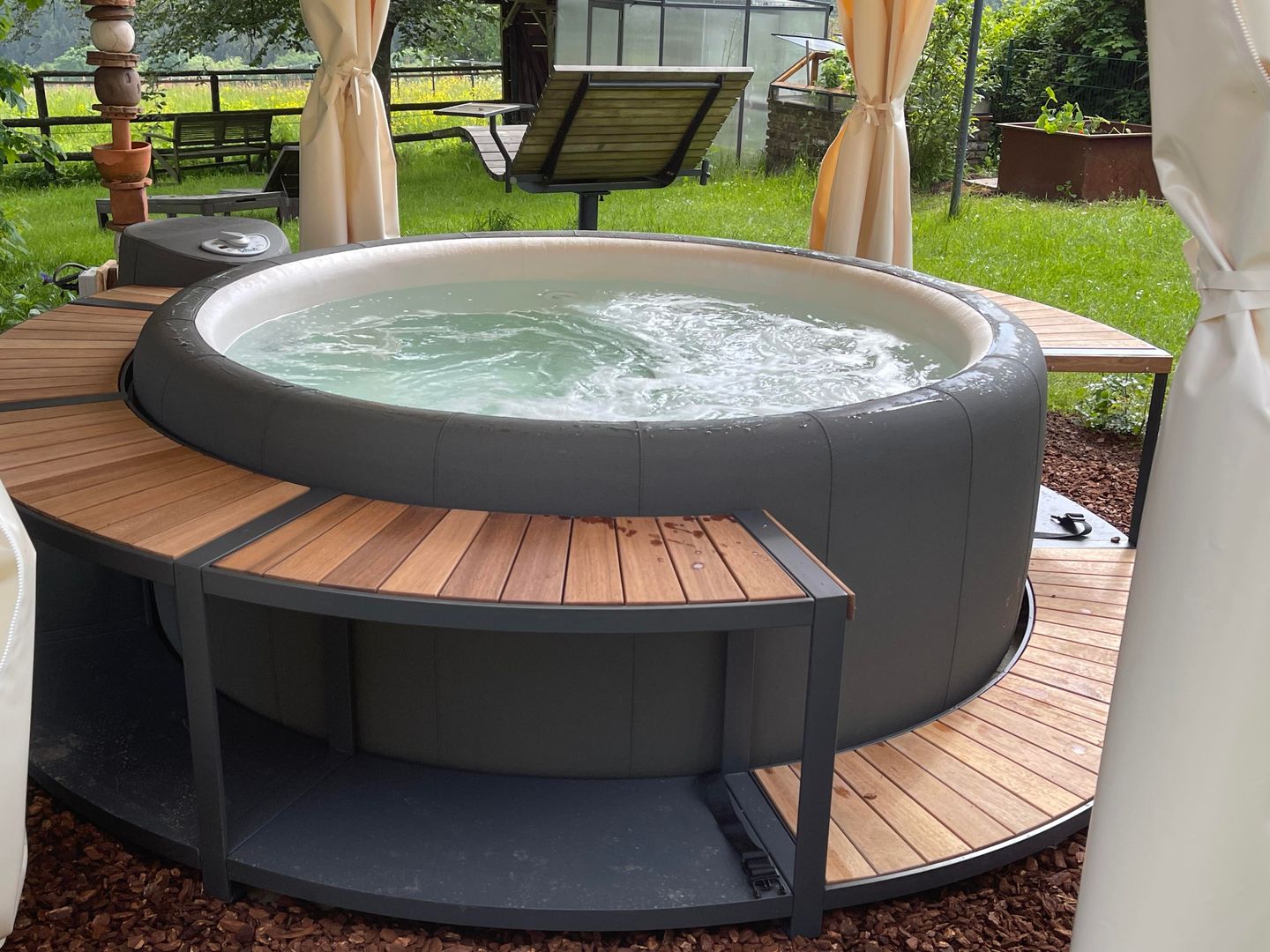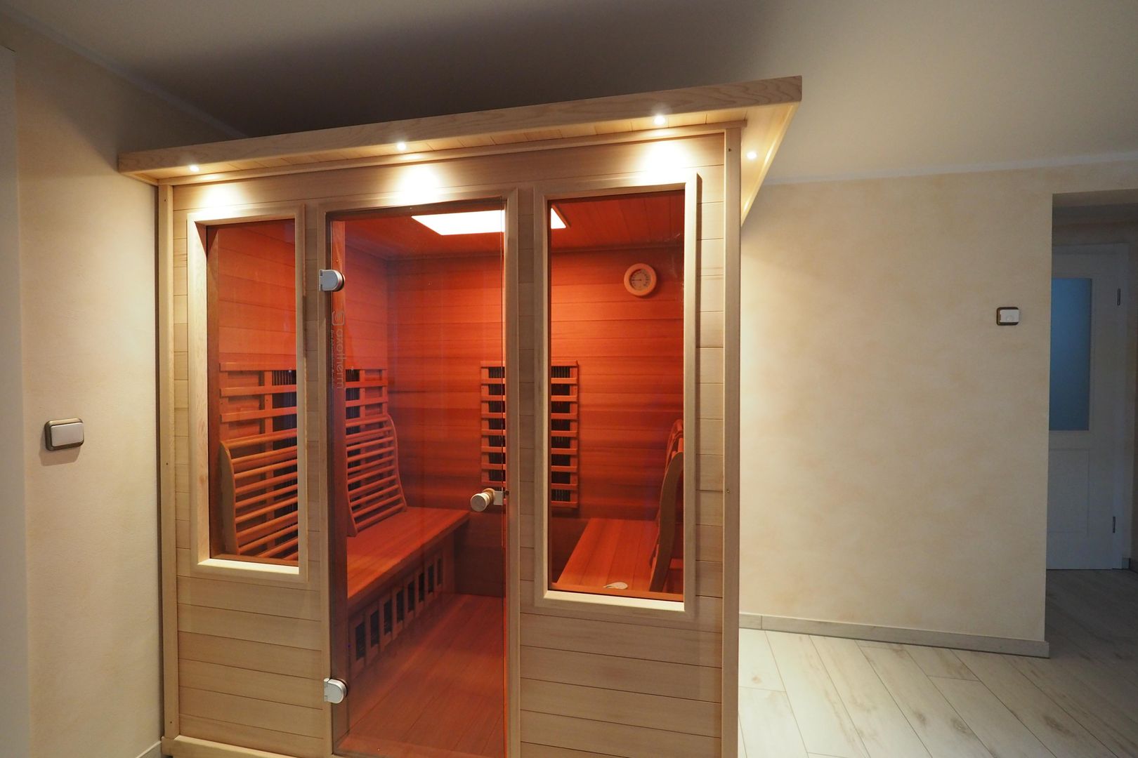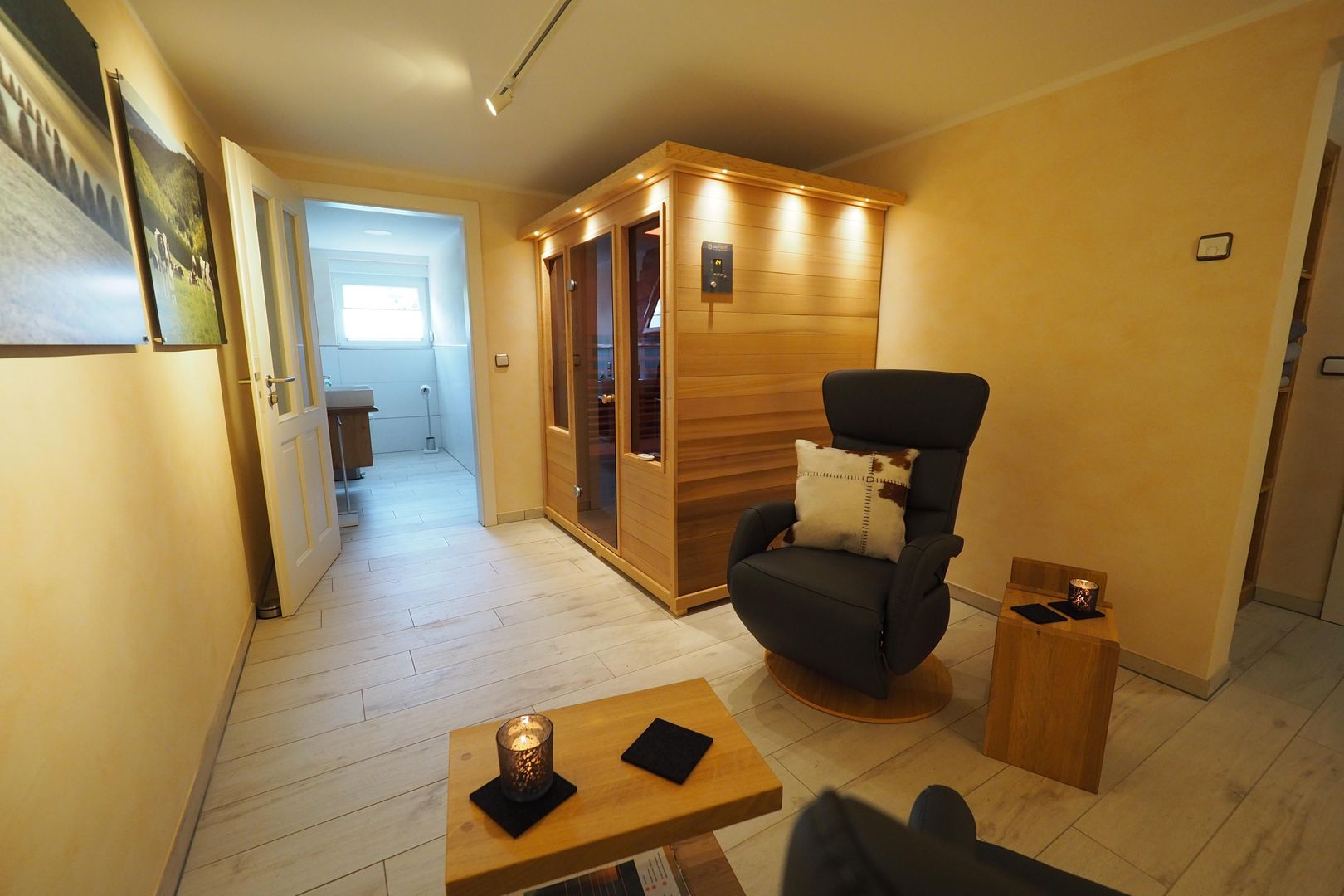 Profitez du confort luxueux de l'espace bien-être avec sauna infrarouge et zone de repos ainsi que de votre propre salle de bain bien-être. Détendez-vous dans notre jacuzzi dans le jardin, entouré de parterres de fleurs et d'une pelouse avec une vue magnifique sur les hauteurs de l'Eifel.