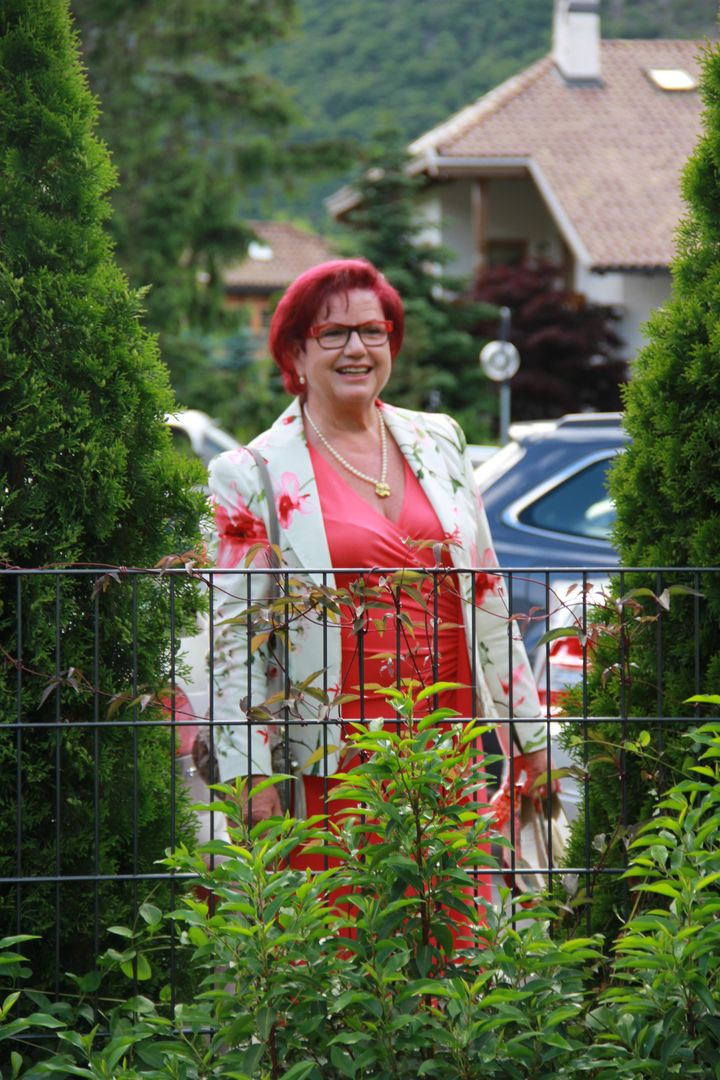 • Une femme aux cheveux rouges se tient devant une clôture, entourée de plantes vertes. Elle porte une veste à fleurs et sourit amicalement.