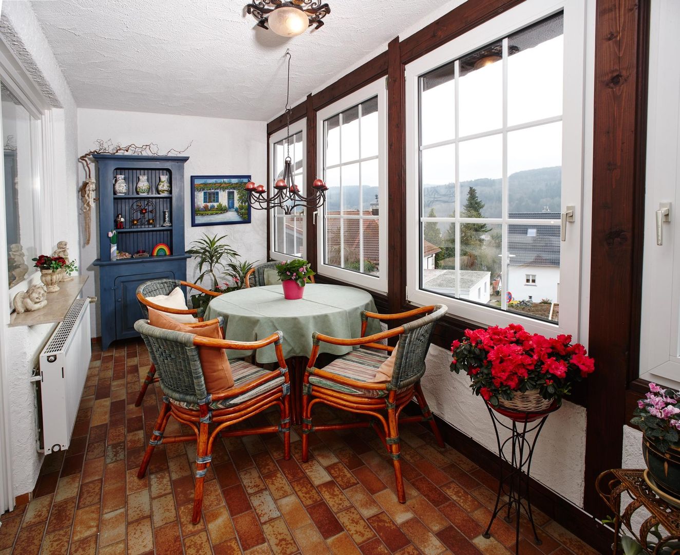 • Une véranda confortable avec une table ronde et des chaises. De grandes fenêtres offrent une vue sur l'extérieur et il y a quelques plantes ainsi que des éléments décoratifs.