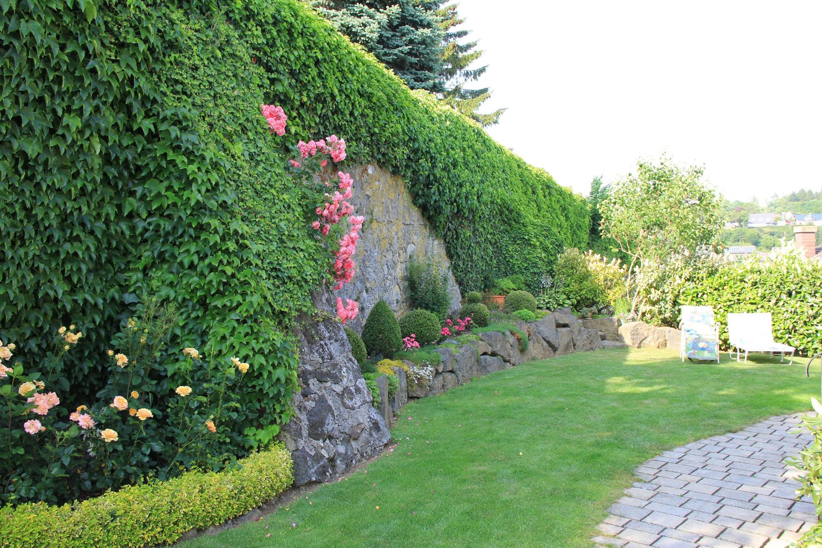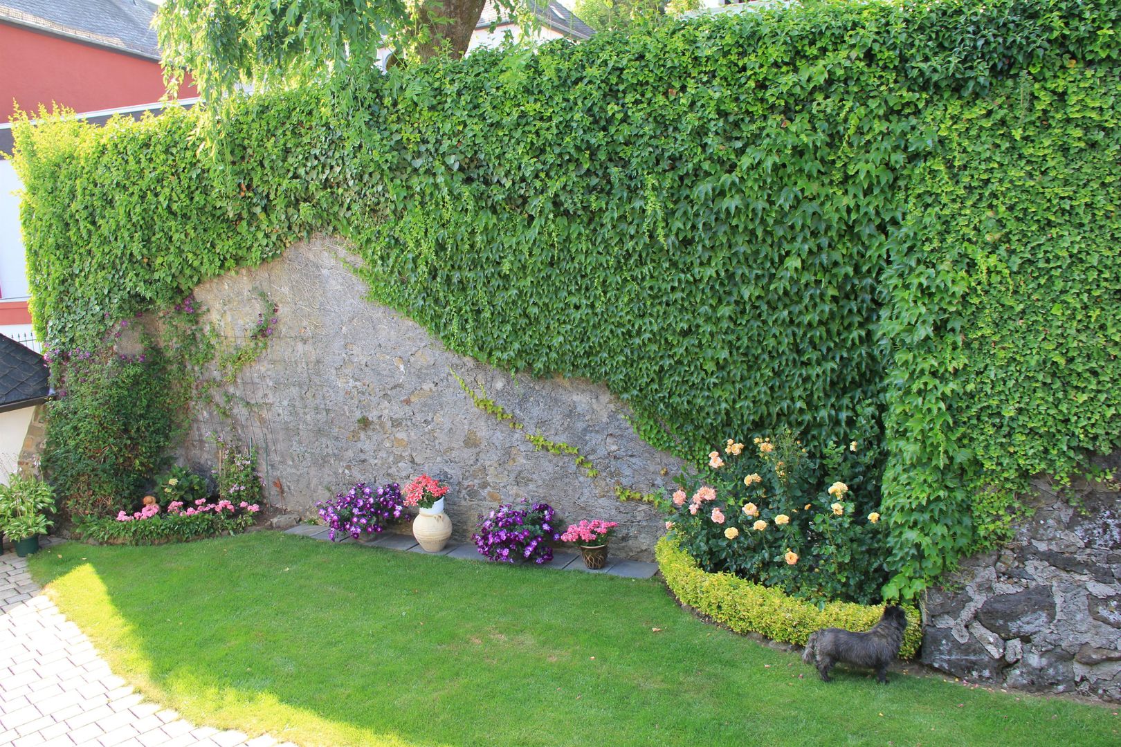 Le jardin avec terrasse et pelouse est encadré par un mur d'enceinte de 4 mètres de haut qui entoure la colline du château de Daun en demi-cercle.