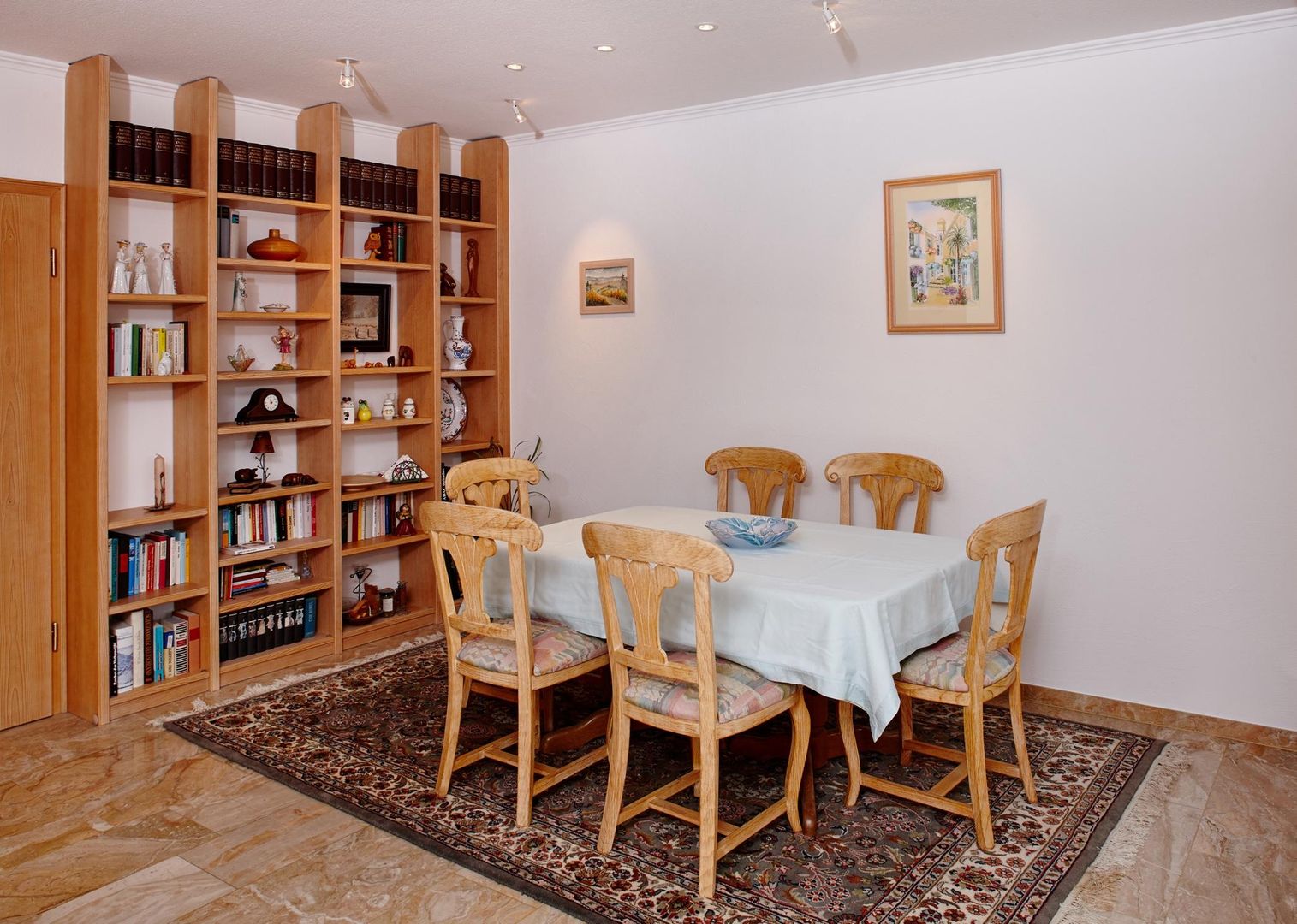 • Une salle à manger accueillante avec une table ronde et six chaises. À l'arrière-plan se trouve une étagère avec différents livres et des objets décoratifs.