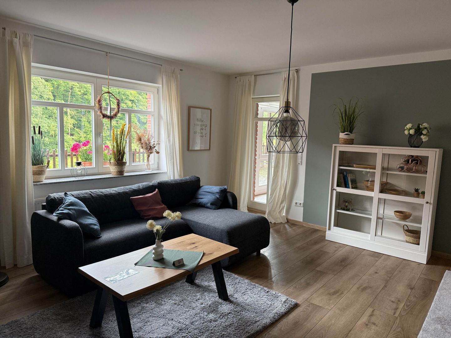 Un salon avec écran plat et un grand canapé-lit pour 1 à 2 invités supplémentaires. Dans la pièce de passage du salon à la salle de bain, un autre canapé-lit de haute qualité avec topper est à disposition si nécessaire.