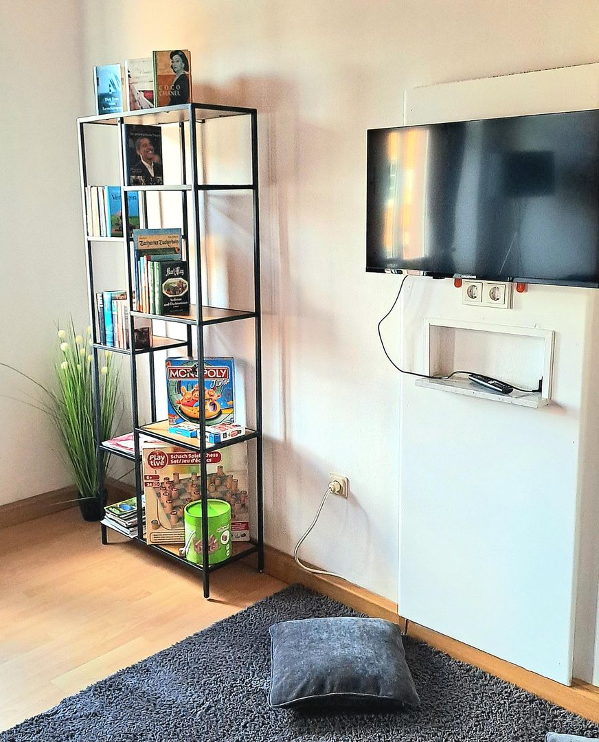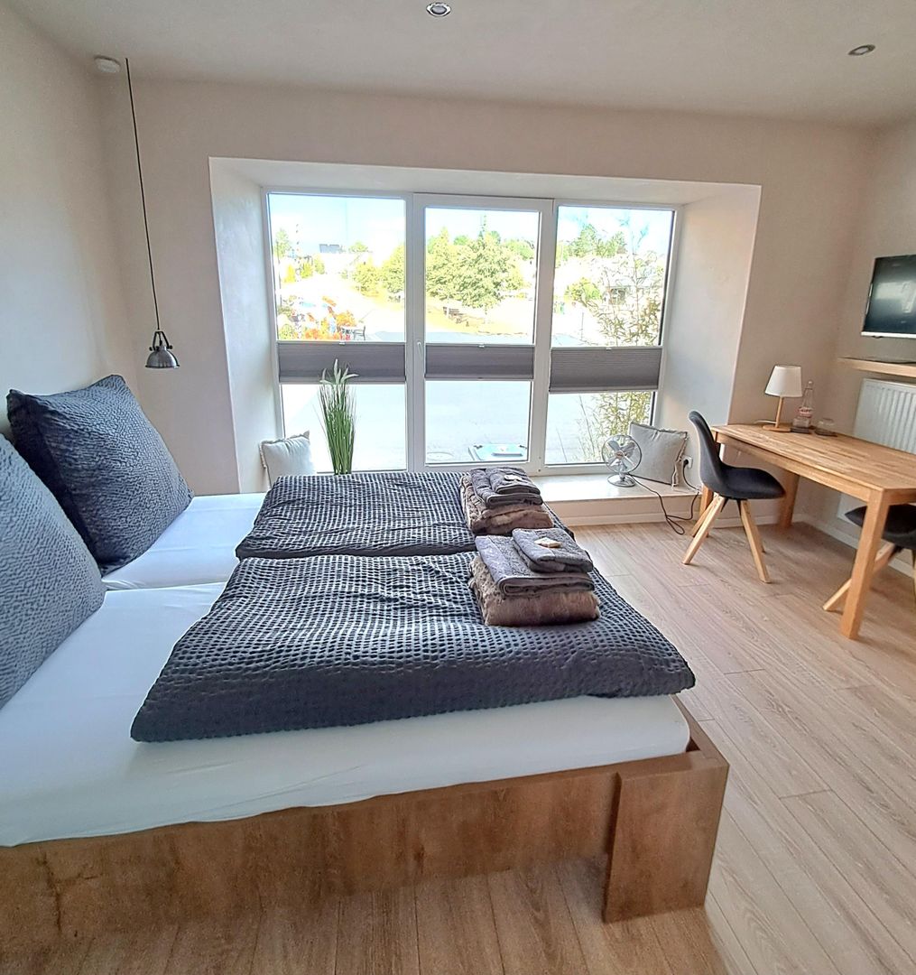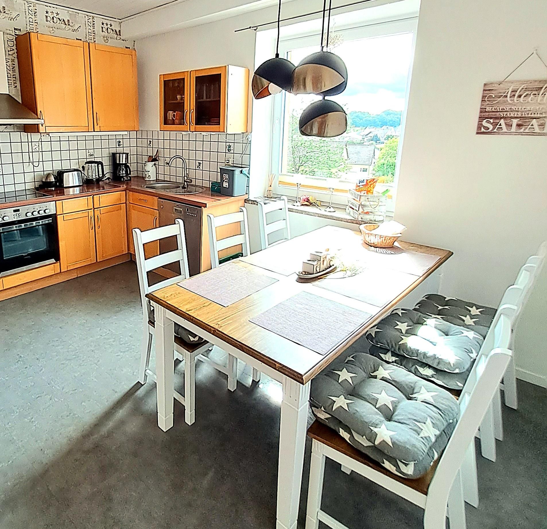 Il a une superficie de 74 m² et dispose de 2 chambres, 1 salon, 1 cuisine, 1 salle de bain. La chambre à coucher la plus spacieuse dispose d'un lit double et d'une armoire à 3 portes ainsi que d'un porte-bagages. Ici, dans la chambre à coucher, il y a aussi la possibilité d'installer un petit lit de voyage. La petite chambre est équipée d'un lit superposé pour adultes et d'une table et d'une chaise de bureau. Les deux chambres sont accessibles depuis le couloir. La salle de séjour, avec son grand canapé extensible, vous invite à vous allonger et à terminer la soirée en écoutant de la bonne musique ou en regardant la télévision. Si vous regardez par les fenêtres du salon, vous aurez une vue imprenable sur le marché aux bestiaux qui se trouve juste à côté et qui est très animé tous les jeudis (jour de marché). De plus, de l'autre côté de la rue se trouve l'Eifel- Alm, un restaurant d'aventure. Les trois chambres sont en outre équipées de volets roulants extérieurs qui garantissent un excellent obscurcissement des chambres. La cuisine spacieuse offre une vue fantastique sur l'ancien mur de la ville datant du 13ème siècle ainsi qu'une vue sur la petite vallée de Bolsdorf, avec son sentier pieds nus de 1,5 km de long et ses 22 stations ainsi que de nombreux sentiers de randonnée. De plus, en regardant par la fenêtre de la cuisine, on peut admirer des couchers de soleil de rêve. La grande table de la cuisine peut accueillir 6 personnes + une chaise d'enfant, ce qui permet à toute la famille de s'asseoir confortablement pour jouer à des jeux de société après le dîner. La salle de bain est équipée d'une baignoire, de toilettes, d'un lavabo, d'un sèche-cheveux et d'un pot pour enfants. Un matelas à langer est également disponible, ainsi qu'une baignoire pour bébé et de la vaisselle pour enfants en double quantité. Une machine à laver et un sèche-linge se trouvent dans la petite buanderie de l'appartement d'hôtes et peuvent être utilisés gratuitement. La taxe touristique de 1,50€ par personne est également incluse, ainsi qu'une bouteille d'eau minérale par personne et une bouteille de vin à l'arrivée et les frais d'énergie. Le linge de lit et une grande + une petite serviette par personne (à utiliser pendant le séjour) sont facturés 15,- € par personne.