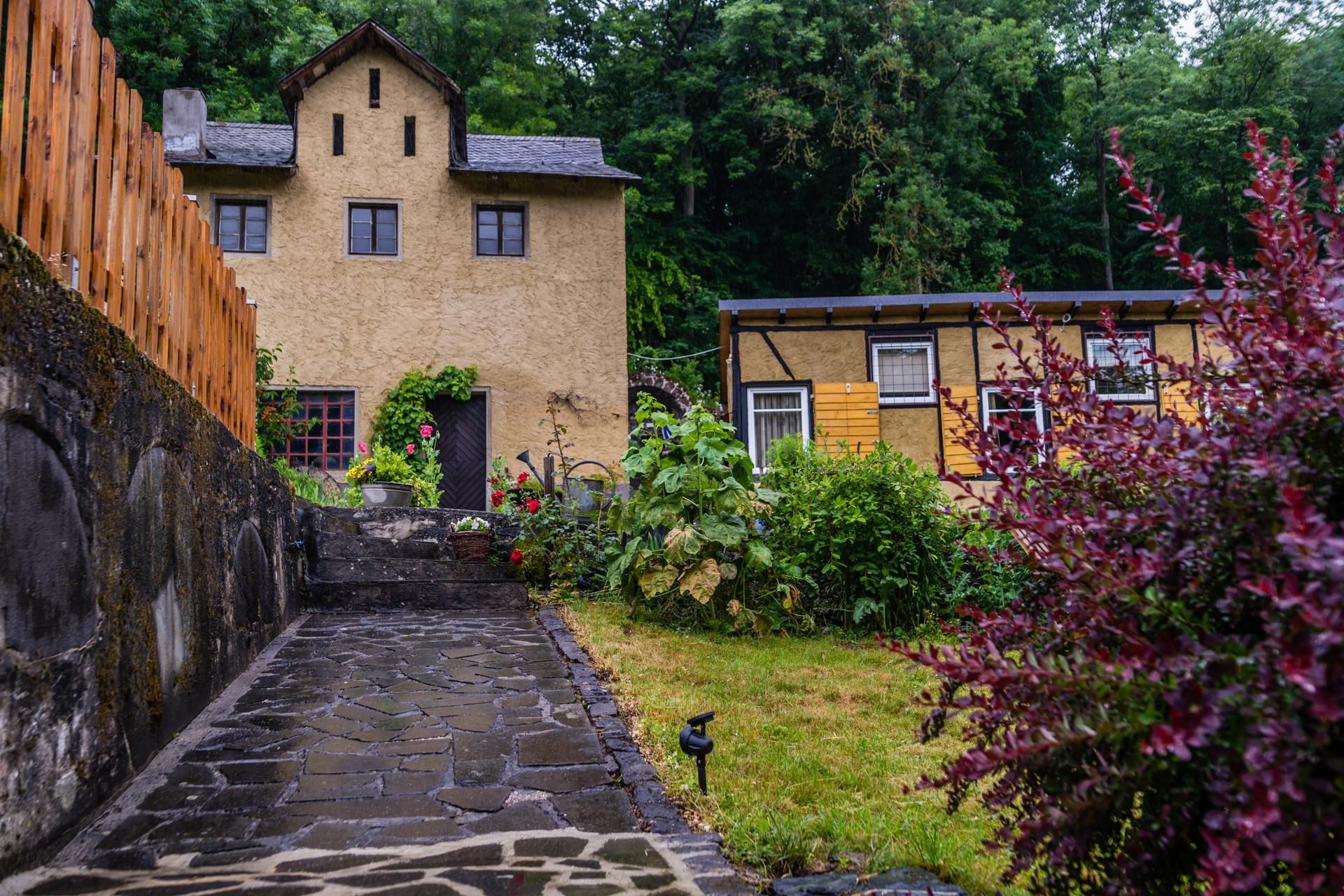 Malgré cette situation isolée, le moulin est très bien desservi par les transports - il dispose de son propre arrêt de bus (400 m) et l'autoroute A 48 est accessible en 5 minutes. Les hôtes passent leurs vacances dans un ancien moulin à eau qui était utilisé pour moudre les céréales et plus tard pour produire de l'huile de colza. La roue à eau du moulin à huile et la technique dans le bâtiment du moulin sont encore entièrement disponibles et peuvent être montrées sur demande. Le moulin se compose de cinq bâtiments, dont certains sont utilisés à des fins d'habitation privée et touristique.