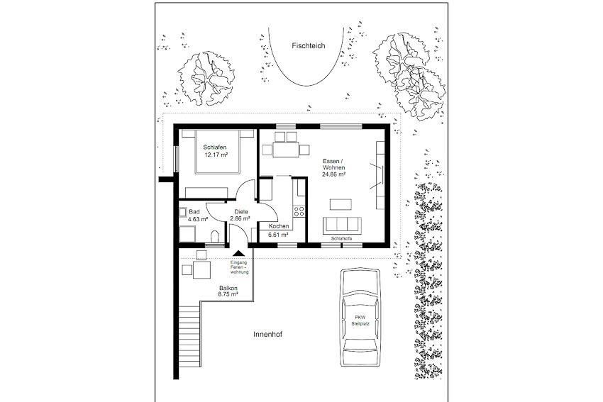 Une aire de repos près de l'étang du jardin peut être utilisée.