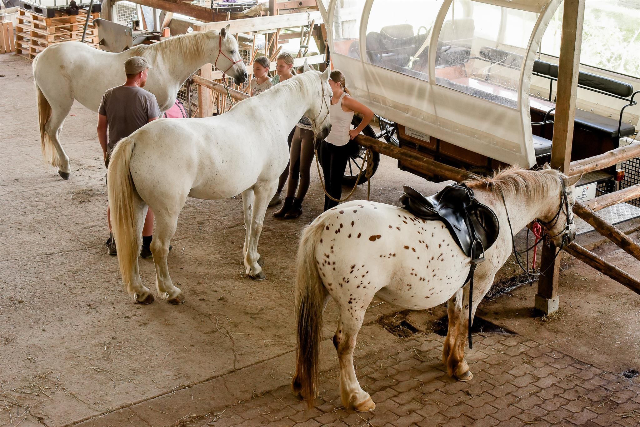 Nos 12 chevaux d'équitation et d'attelage font battre plus fort le cœur de toutes les filles et de tous les autres. Dans notre large offre d'équitation, chacun y trouve son compte. Promenades guidées à la main à travers champs et forêts pour les plus petits. Nous enseignons les premiers pas à cheval au pas et au trot sur notre manège. Ensuite, nous proposons des randonnées à l'heure au pas et au trot ou au pas, au trot et au galop. Ceux qui ont encore plus d'expérience peuvent participer à une randonnée de plusieurs heures avec une pause agréable. Chaque jour, nous allons ensemble chercher les chevaux au pâturage, nous les pansons, nous les harnachons et nous les sellons. Une fois le travail terminé, les chevaux profitent d'une fin de journée bien méritée dans les pâturages. Mais ils peuvent aussi découvrir les beautés romantiques du sud de l'Eifel depuis le siège de la calèche du Nengshof. Lors de promenades en calèche d'une ou plusieurs heures, ils découvrent le paysage au rythme des chevaux, et il est également possible de faire ses premières expériences à la longe.