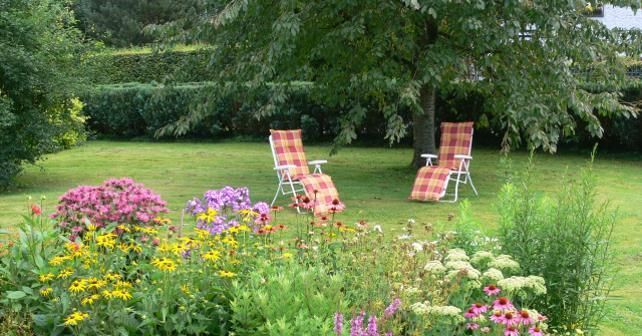 Une grande pelouse et des chaises longues invitent à prendre un bain de soleil. Des garages et un grand parking se trouvent à la maison même.