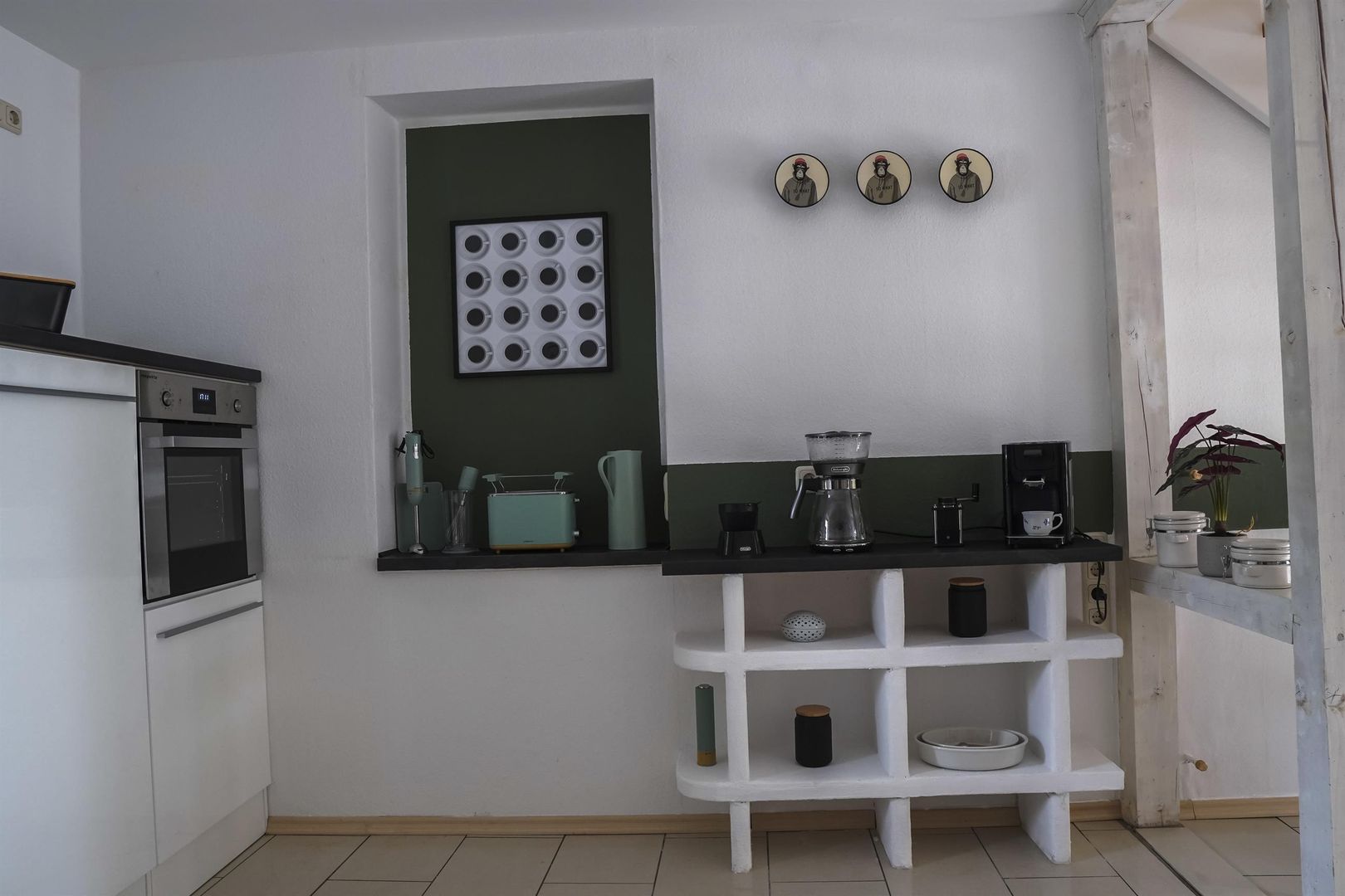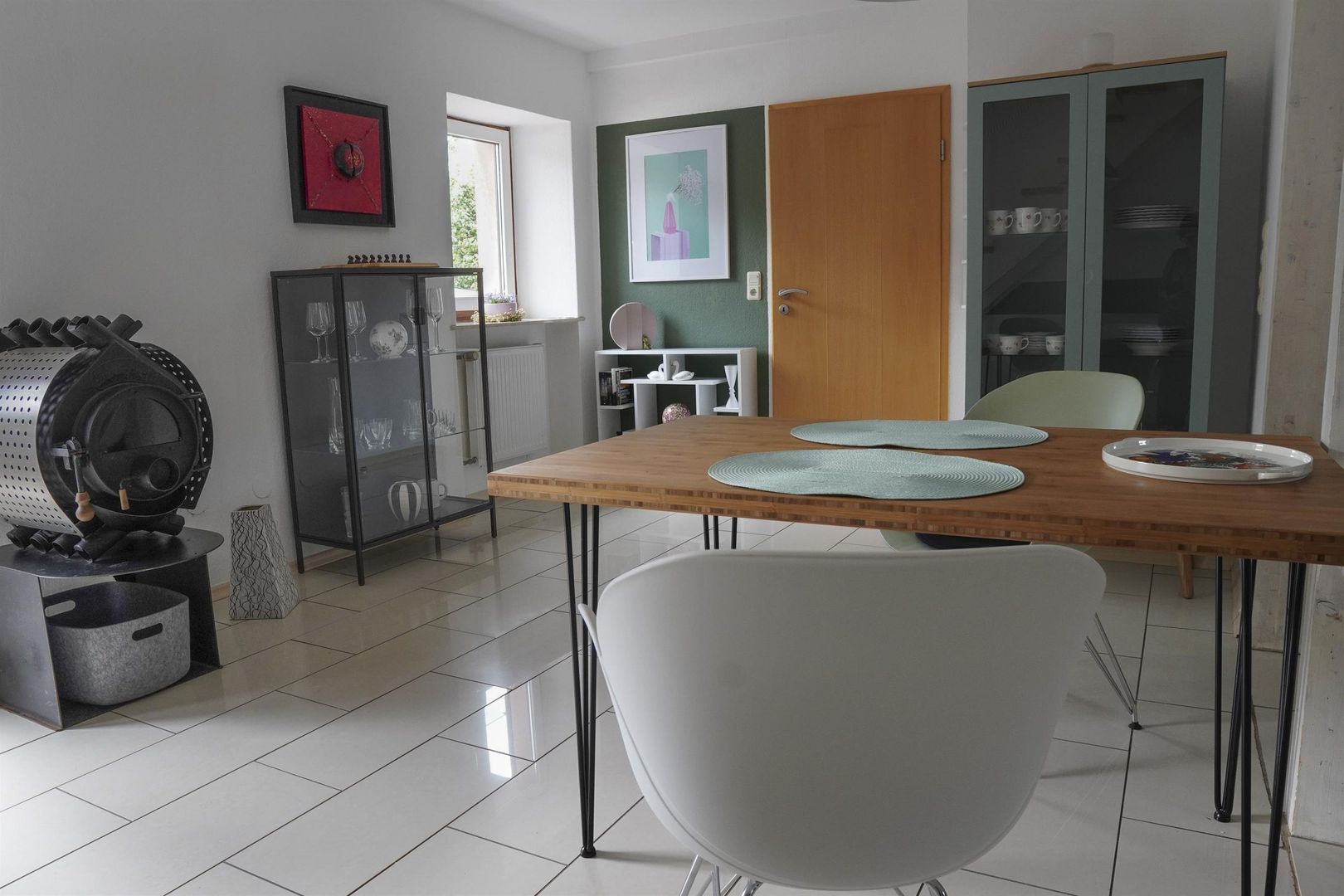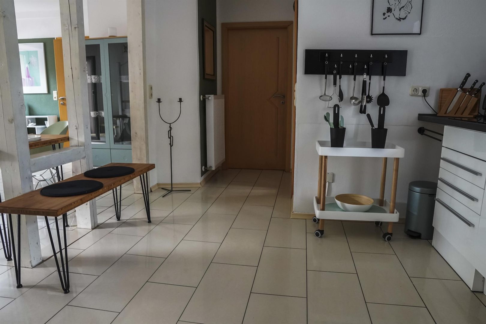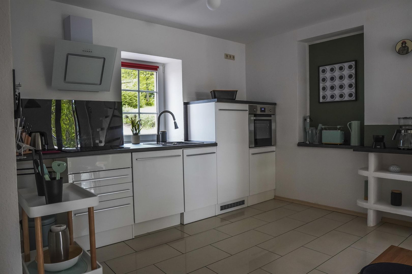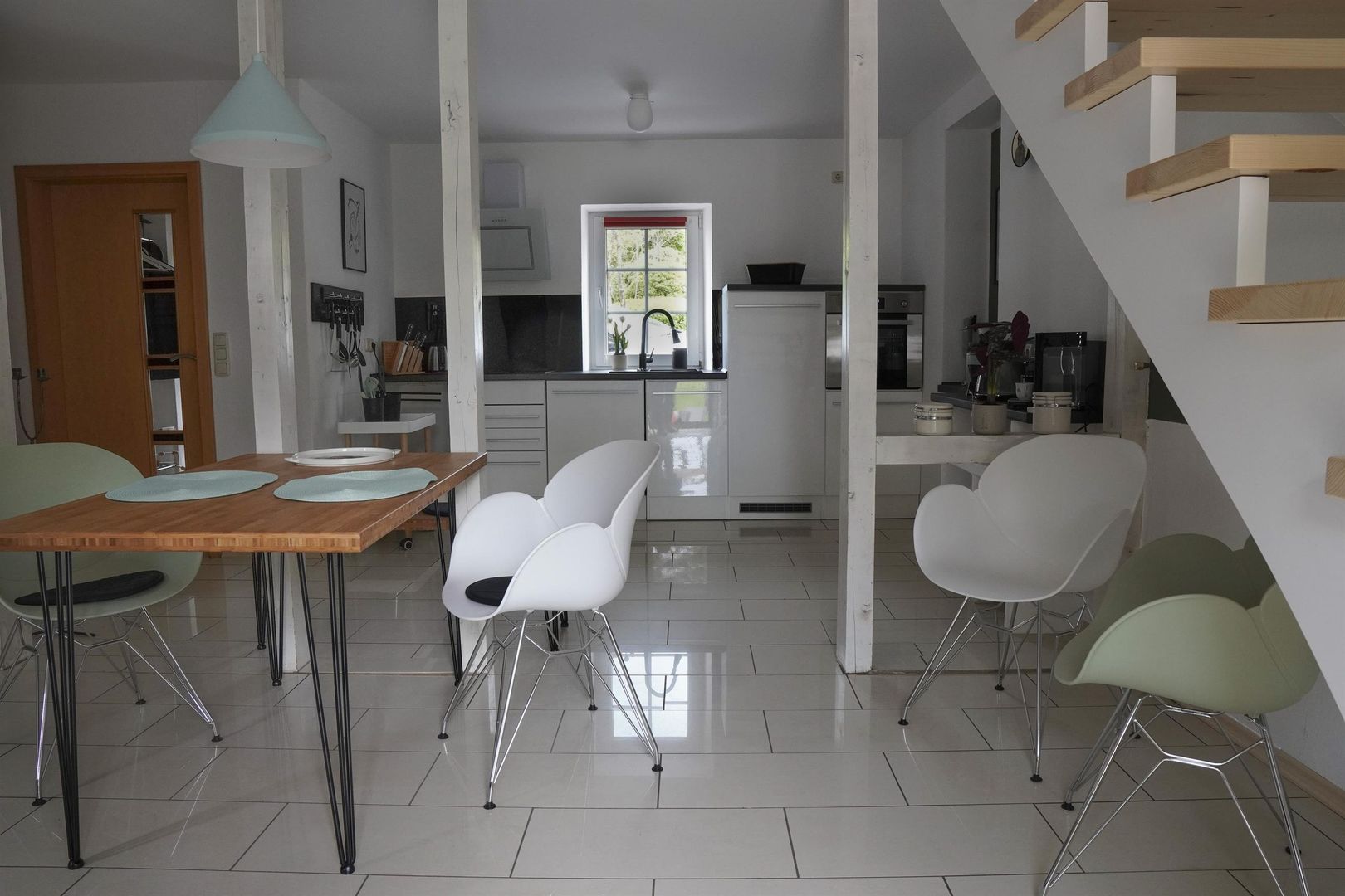 Le rez-de-chaussée tient à disposition un petit couloir avec vestiaire et un coffre à bagages séparé. La cuisine ouverte et moderne est équipée d'un lave-vaisselle, d'une plaque vitrocéramique, d'un four, d'une machine à café, d'un grille-pain et bien d'autres choses encore, et offre un coin repas avec 4 chaises.