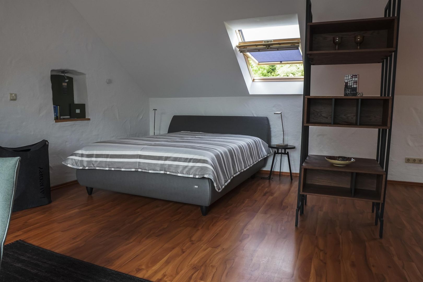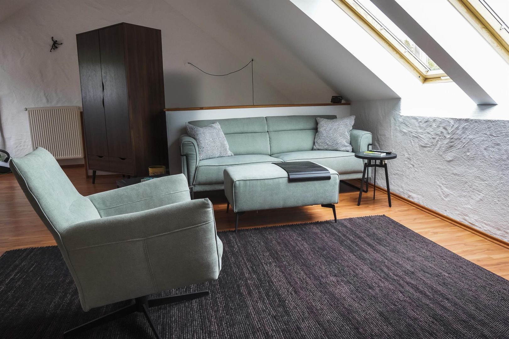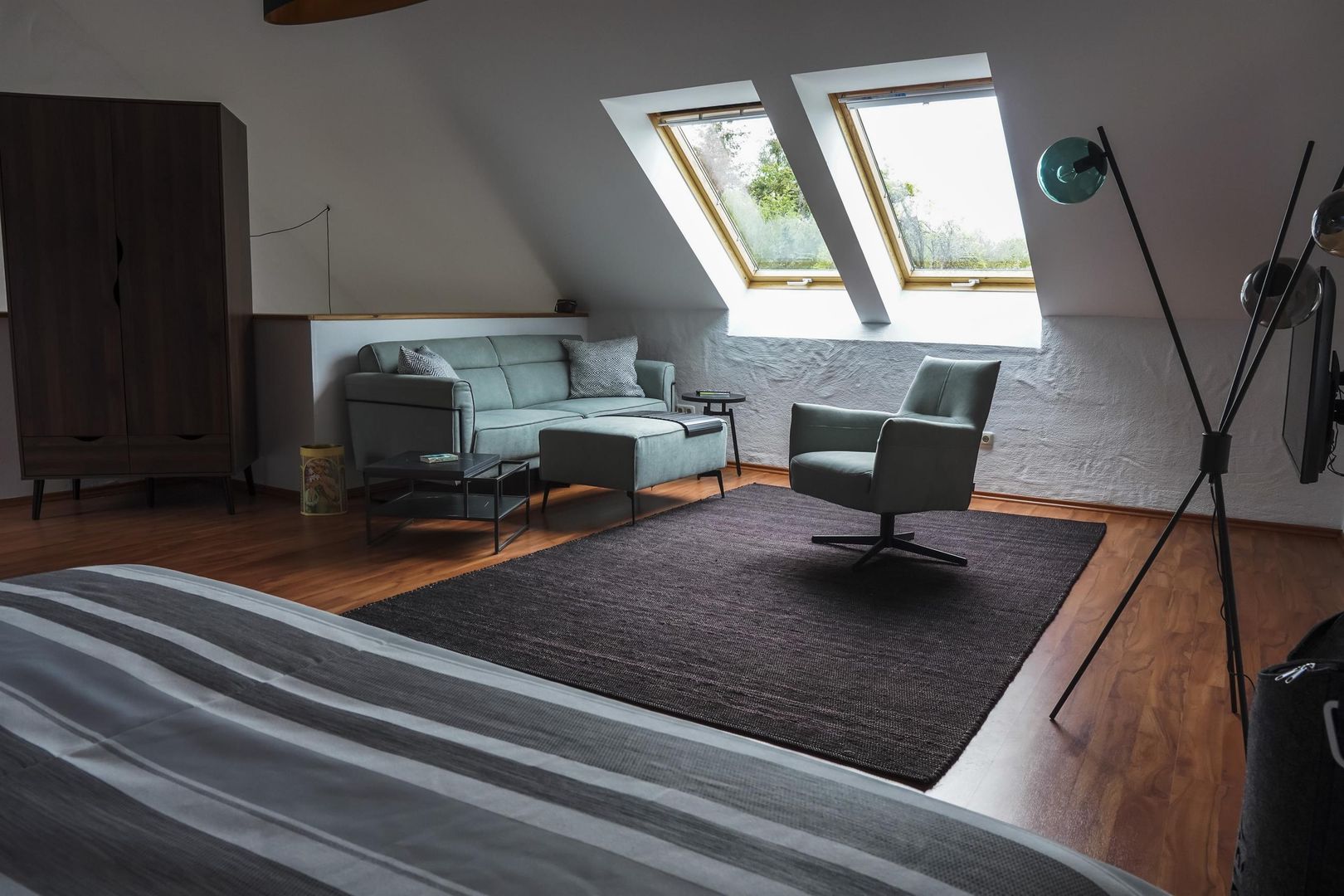 Vaste espace de vie avec canapé, fauteuil TV, tabouret, table ronde avec chaises, armoire, étagère, lit boxspring (1,60 m de large), lucarne avec stores pare-soleil.