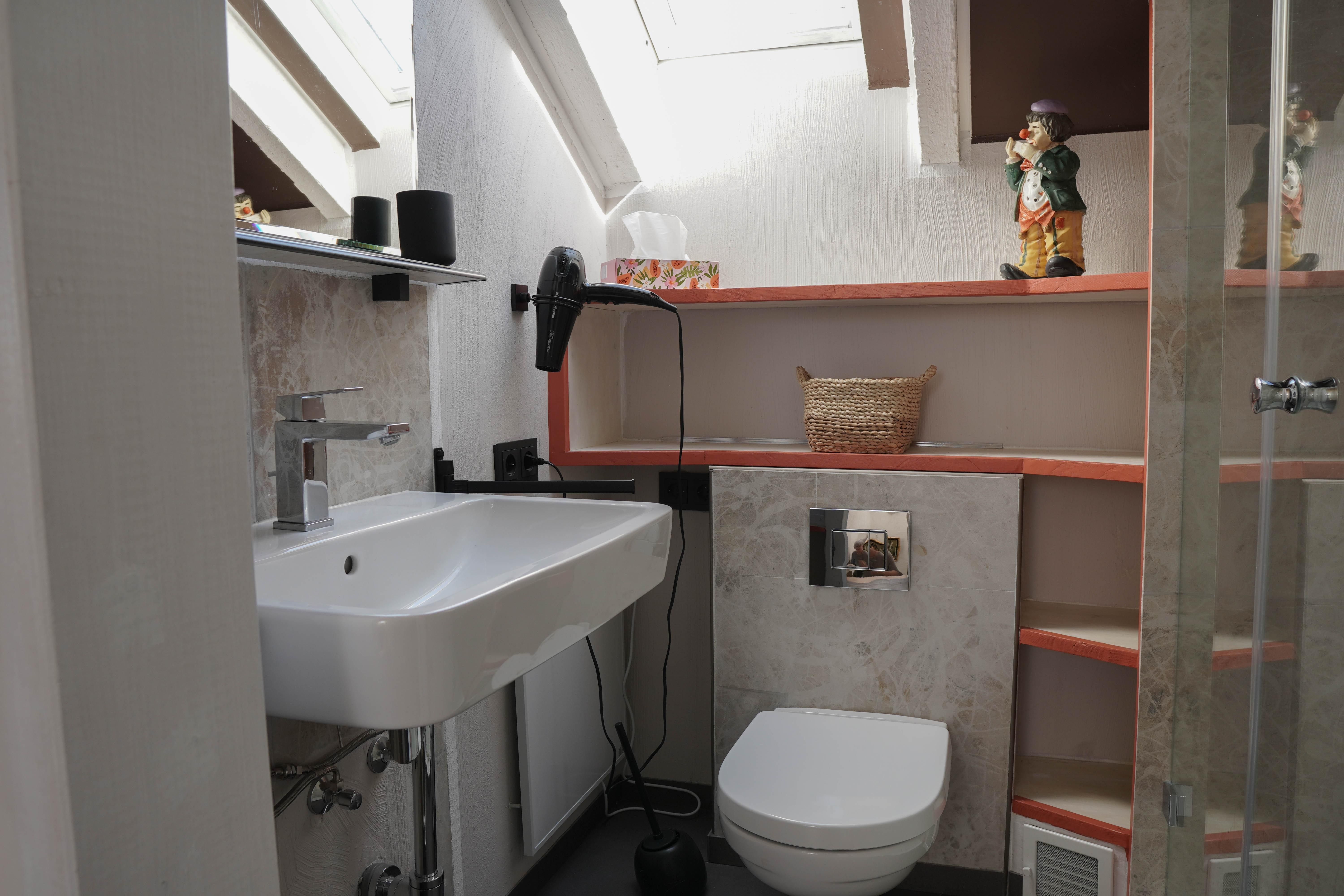 Je peux accueillir jusqu'à quatre personnes sur une surface d'environ 80 m². À l'étage supérieur, il y a deux chambres à coucher : l'une avec un confortable lit boxspring (1,60 m) et un balcon, l'autre avec deux lits simples (1 x 2 m) - toutes deux avec leur propre télévision. La salle de bain avec lumière du jour se trouve également à l'étage.