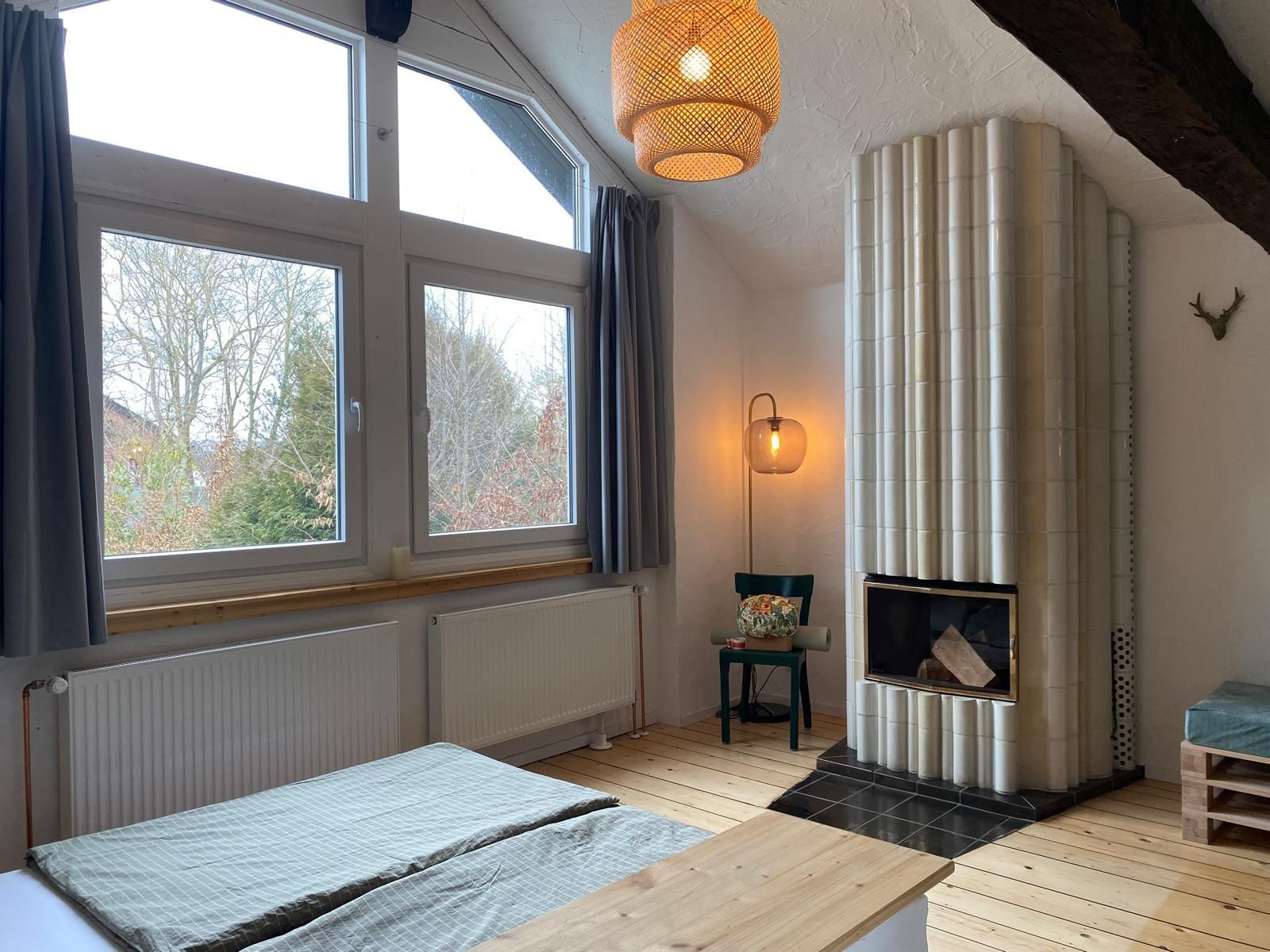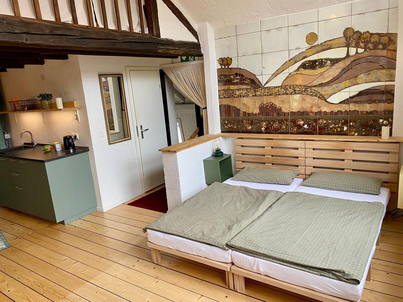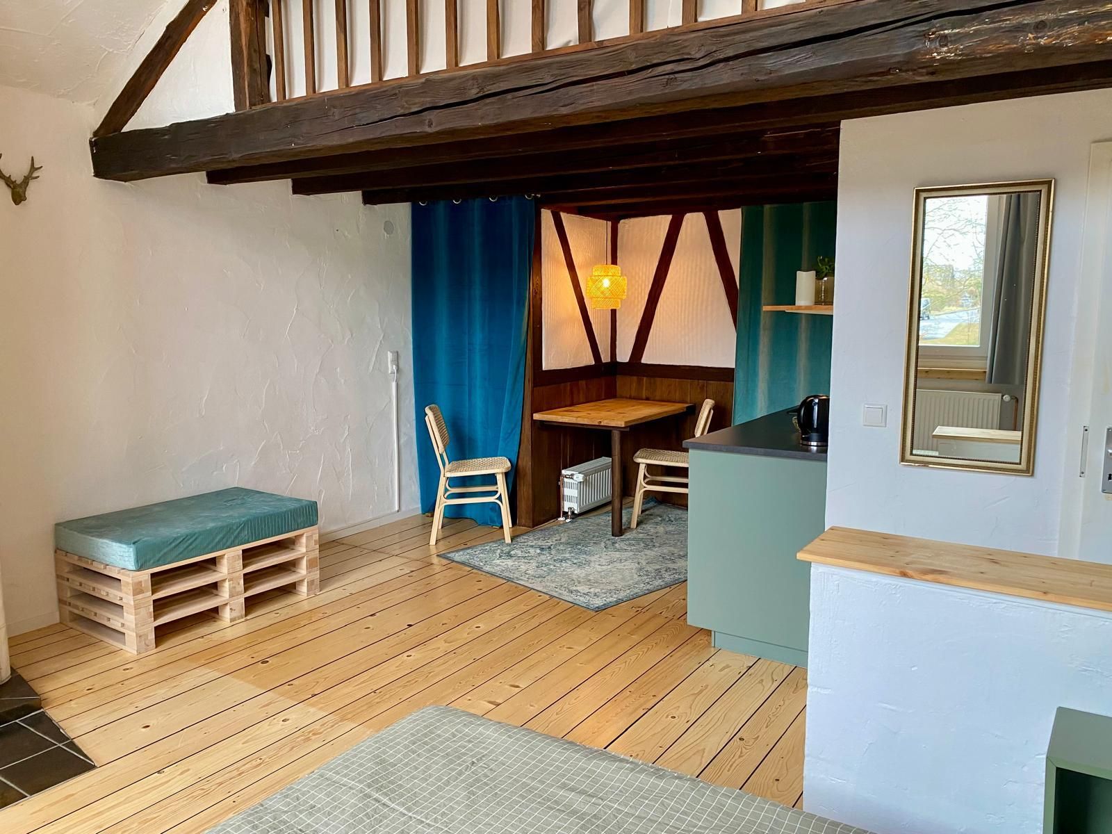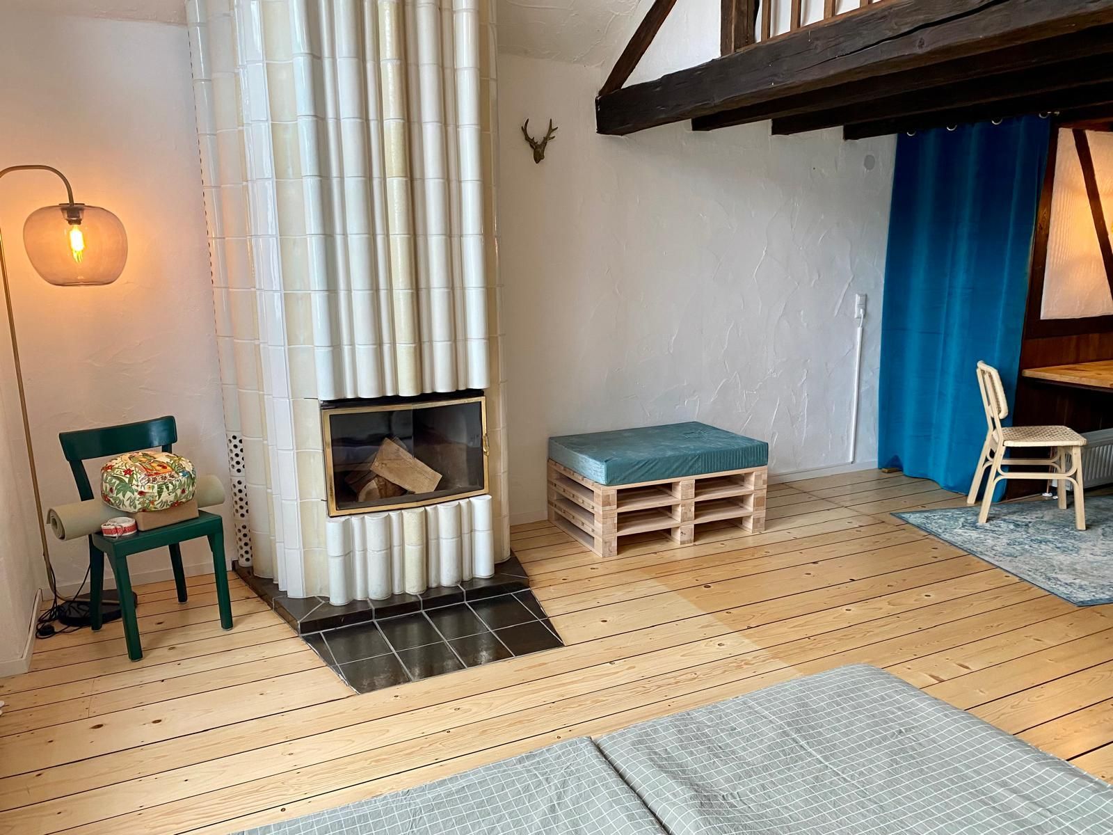 Le charme particulier de la chambre des pèlerins est donné par sa construction en colombages historique et ses couleurs naturelles. Par un escalier, vous accédez à la pièce d'environ 25 m². Dans deux zones, il y a au total quatre lits. Elle est directement reliée à un petit WC avec lavabo. La douche ainsi qu'un autre WC/ lavabo se trouvent au rez-de-chaussée. Des serviettes sont mises à votre disposition. Au rez-de-chaussée se trouve également la salle commune, qui est notre espace de repas et de convivialité, avec une cheminée, une télévision et des jeux de société. Nos espaces sont conçus selon le Feng Shui.