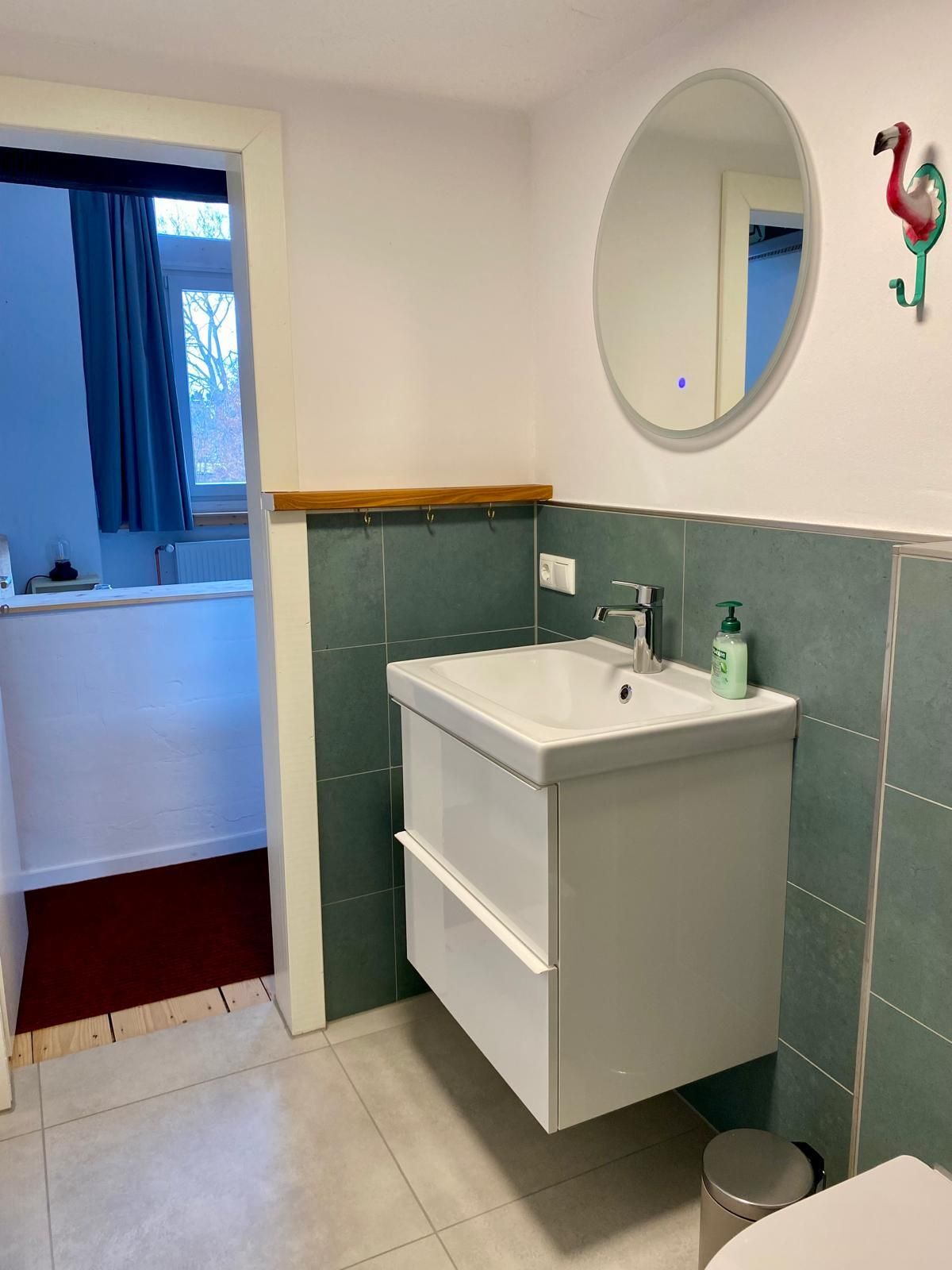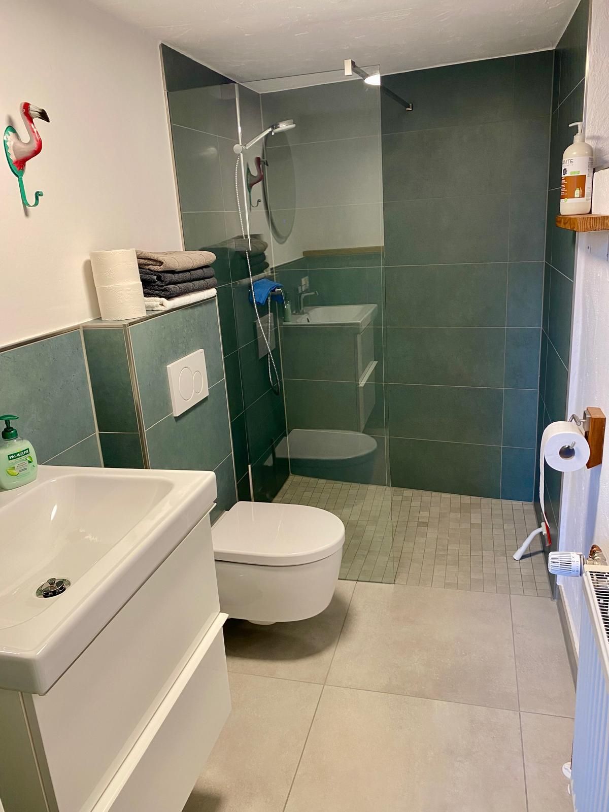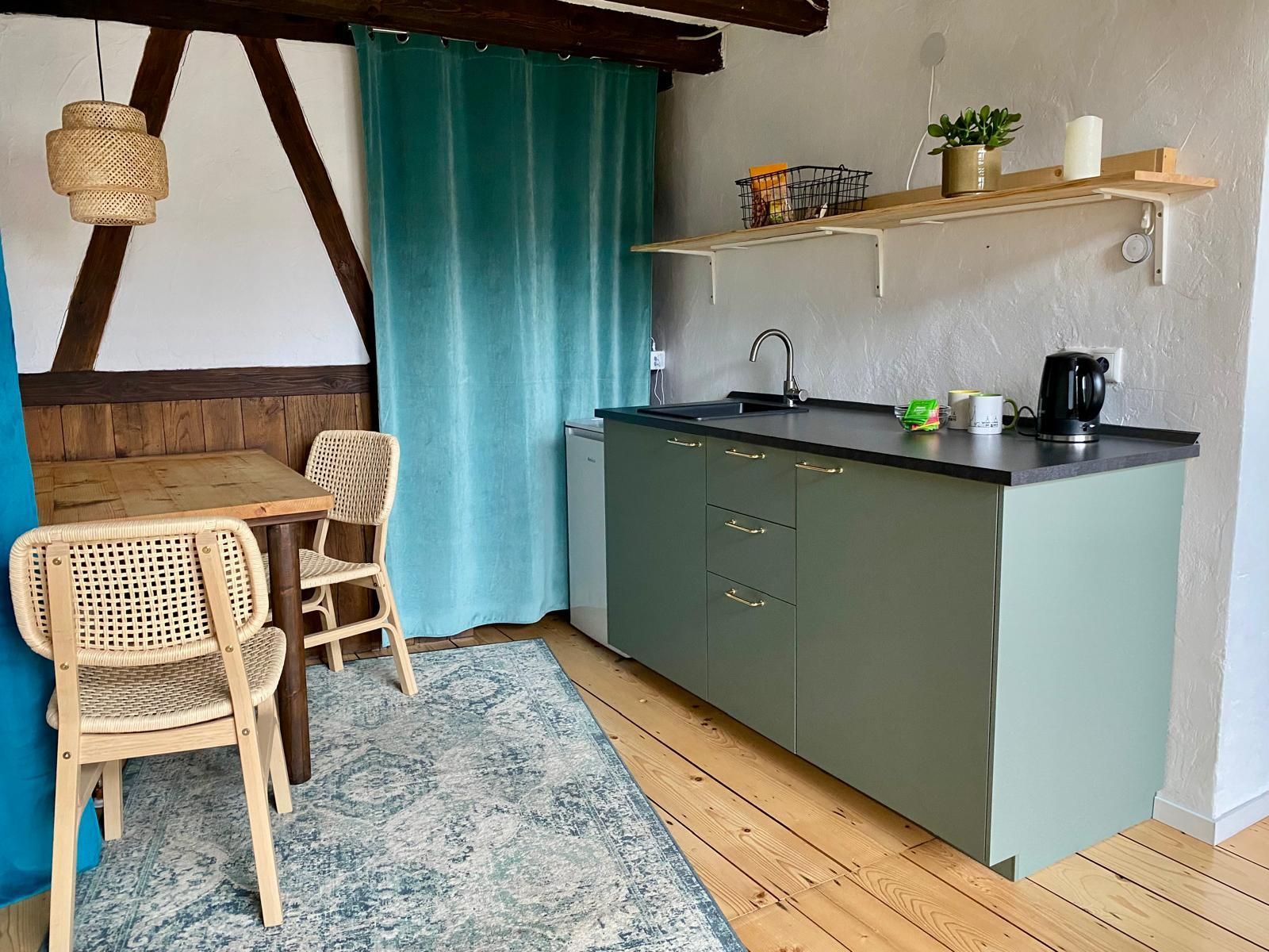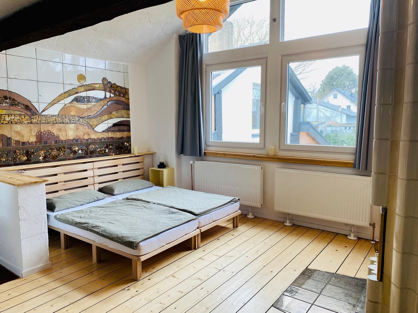 Le charme particulier de la chambre des pèlerins est donné par sa construction en colombages historique et ses couleurs naturelles. Par un escalier, vous accédez à la pièce d'environ 25 m². Dans deux zones, il y a au total quatre lits. Elle est directement reliée à un petit WC avec lavabo. La douche ainsi qu'un autre WC/ lavabo se trouvent au rez-de-chaussée. Des serviettes sont mises à votre disposition. Au rez-de-chaussée se trouve également la salle commune, qui est notre espace de repas et de convivialité, avec une cheminée, une télévision et des jeux de société. Nos espaces sont conçus selon le Feng Shui.