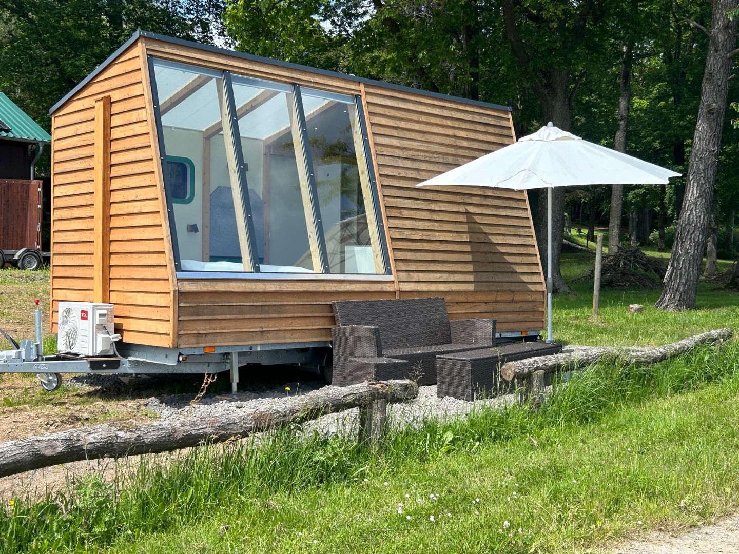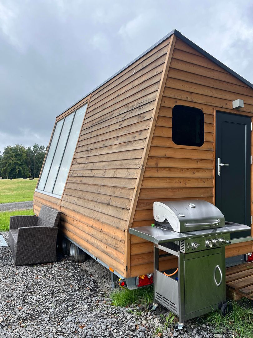 À l'extérieur, un ensemble de sièges confortables avec parasol invite à se détendre tout en profitant de la vue magnifique. À côté de la tiny house se trouve un barbecue, idéal pour des soirées conviviales en plein air.
