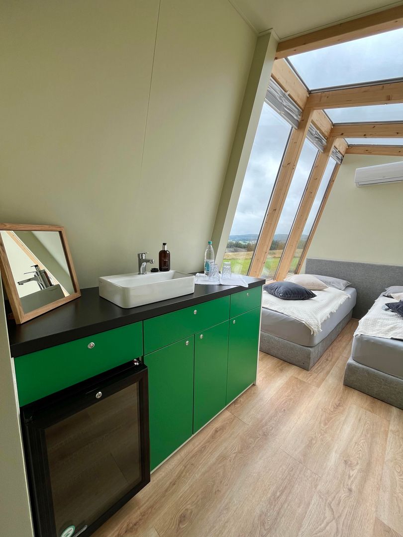 Pour un confort maximal, un code électrique à chiffres permet d'arriver à n'importe quelle heure. De plus, deux places de parking pour voitures sont disponibles juste à côté de la tiny house, ce qui rend l'arrivée et le départ particulièrement pratiques. Le logement dispose en outre d'un réfrigérateur, d'un évier, de couverts, d'assiettes et de serviettes.