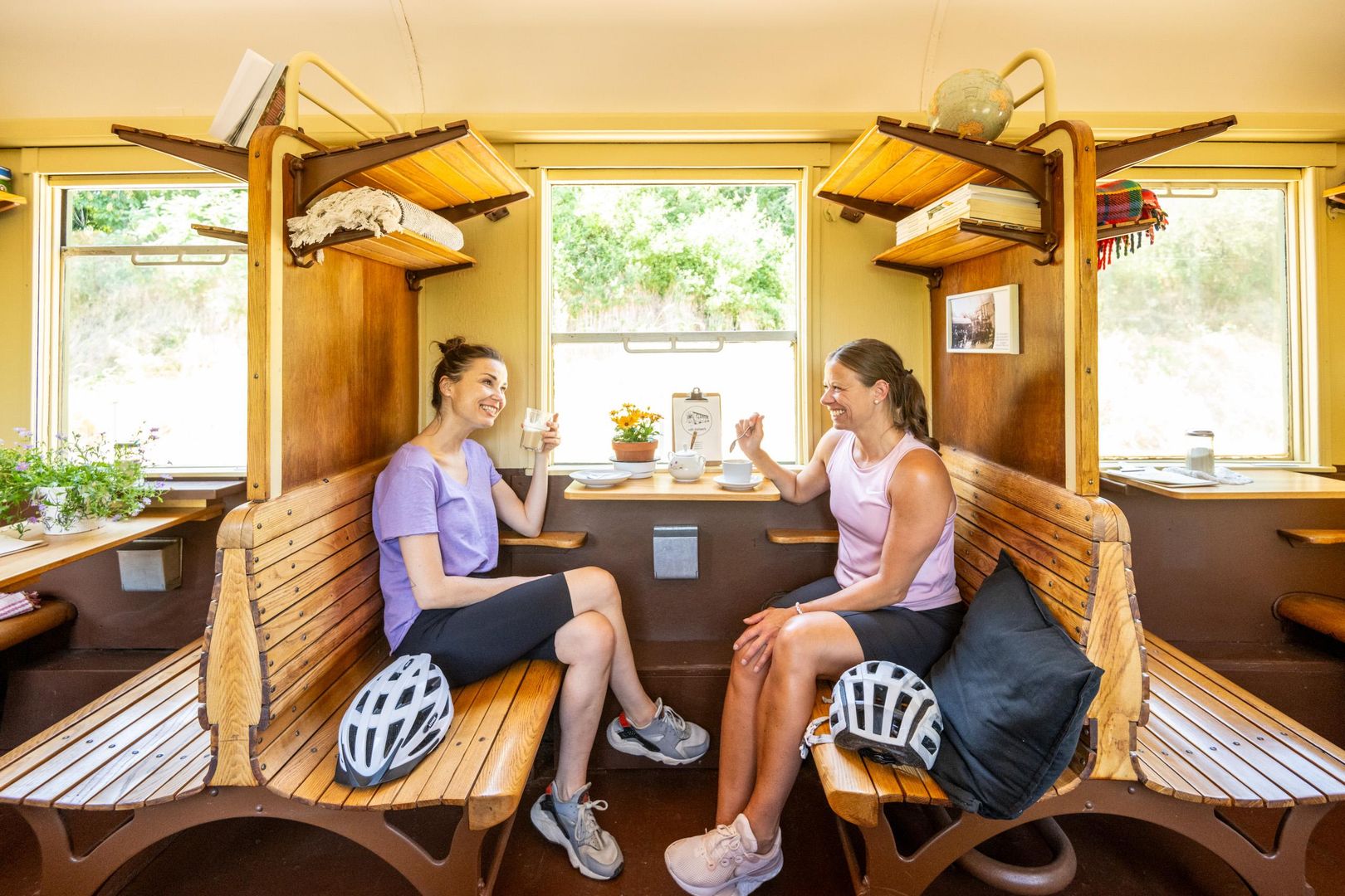 Gemütliches Cafe in einem Eisenbahnwaggon mit Außenterrasse. Genießen Sie den selbstgebackenen Kuchen mit einem leckeren Kaffee.