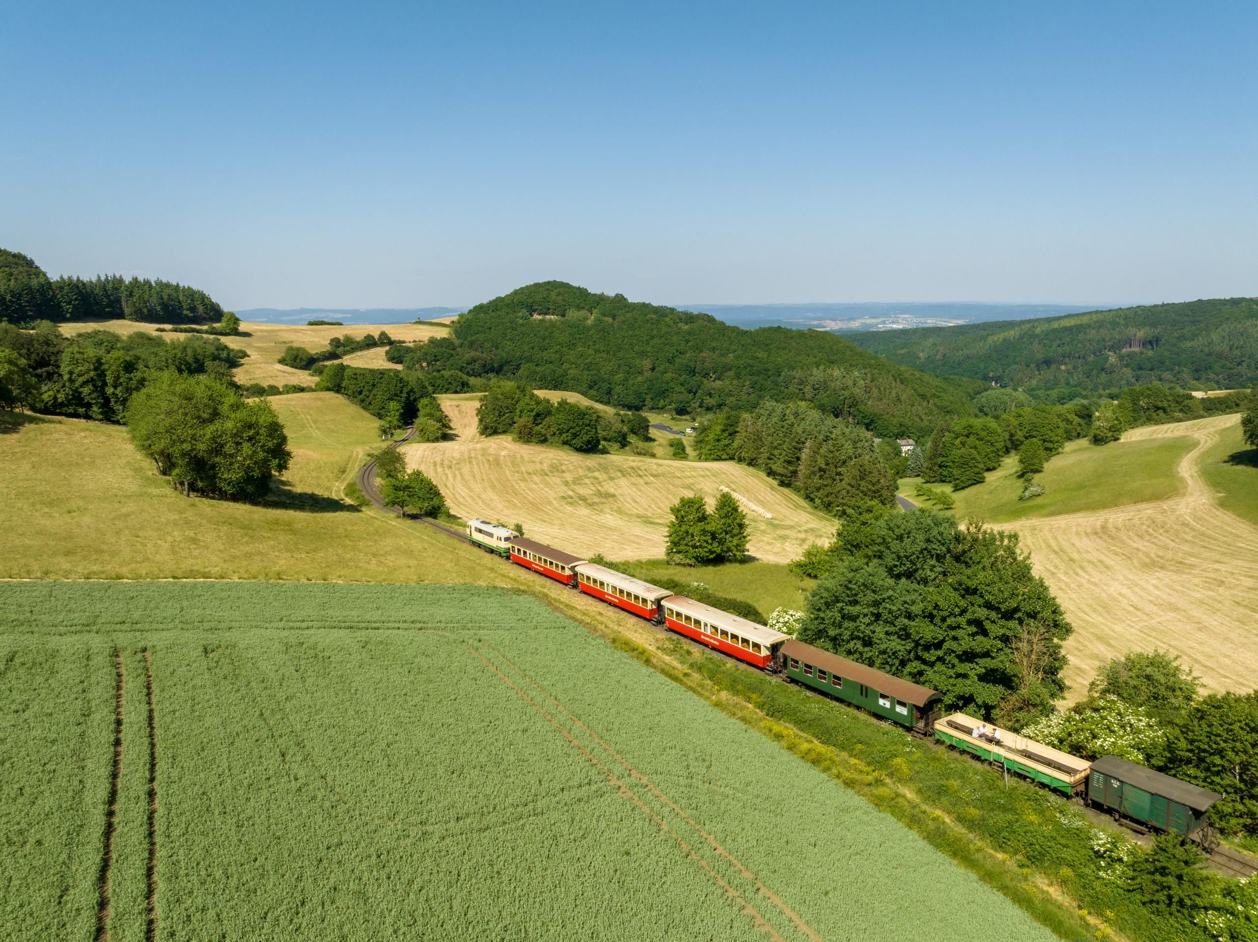 Op het bijna 18 km lange smalspoortraject van Brohl am Rhein tot Engeln in de Eifel steekt onze trein meerdere hoge viaducten over en doorkruist een bijna 100 meter lange tunnel. Bijna 400 hoogtemeters worden overwonnen! Op de meeste dagen worden onze treinen getrokken door groen/beige gelakte diesel locomotieven. Ervaar hoe onze locomotieven net op het steile traject tussen Oberzissen en Engeln al hun krachten moeten inzetten om de trein op tijd op de bestemming te brengen! Op geselecteerde dagen zetten we regelmatig ook onze historische stoomlocomotief "11sm" in.