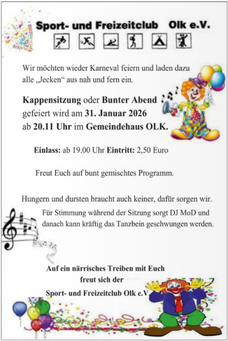 Verwacht een gevarieerd programma - niemand hoeft te honger en dorst te lijden, daarvoor zorgen wij. Voor de sfeer tijdens de zitting zorgt DJ MoD en daarna kan er flink gedanst worden. De Sport- en Vrijetijdclub Olk e.V. kijkt uit naar een gekke avond met jullie.