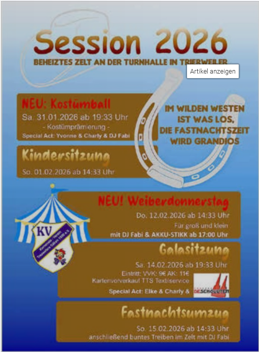Carnaval in Trierweiler +++ Sessioen 2026+++ NIEUW: Kostuumbal +++ 31 januari 2026 (zaterdag) +++ 19:33 uur+++ Kindersessie +++ 01 februari 2026 (zondag) +++ 14:33 uur+++ NIEUW! Vrouwendonderdag +++ 12 februari 2026 (donderdag) +++ 14:33 uur+++ Galasessie +++ 14 februari 2026 (zaterdag) +++ 19:33 uur+++ Vastelaovendoptocht +++ 15 februari 2026 (zondag) +++ 14:33 uur