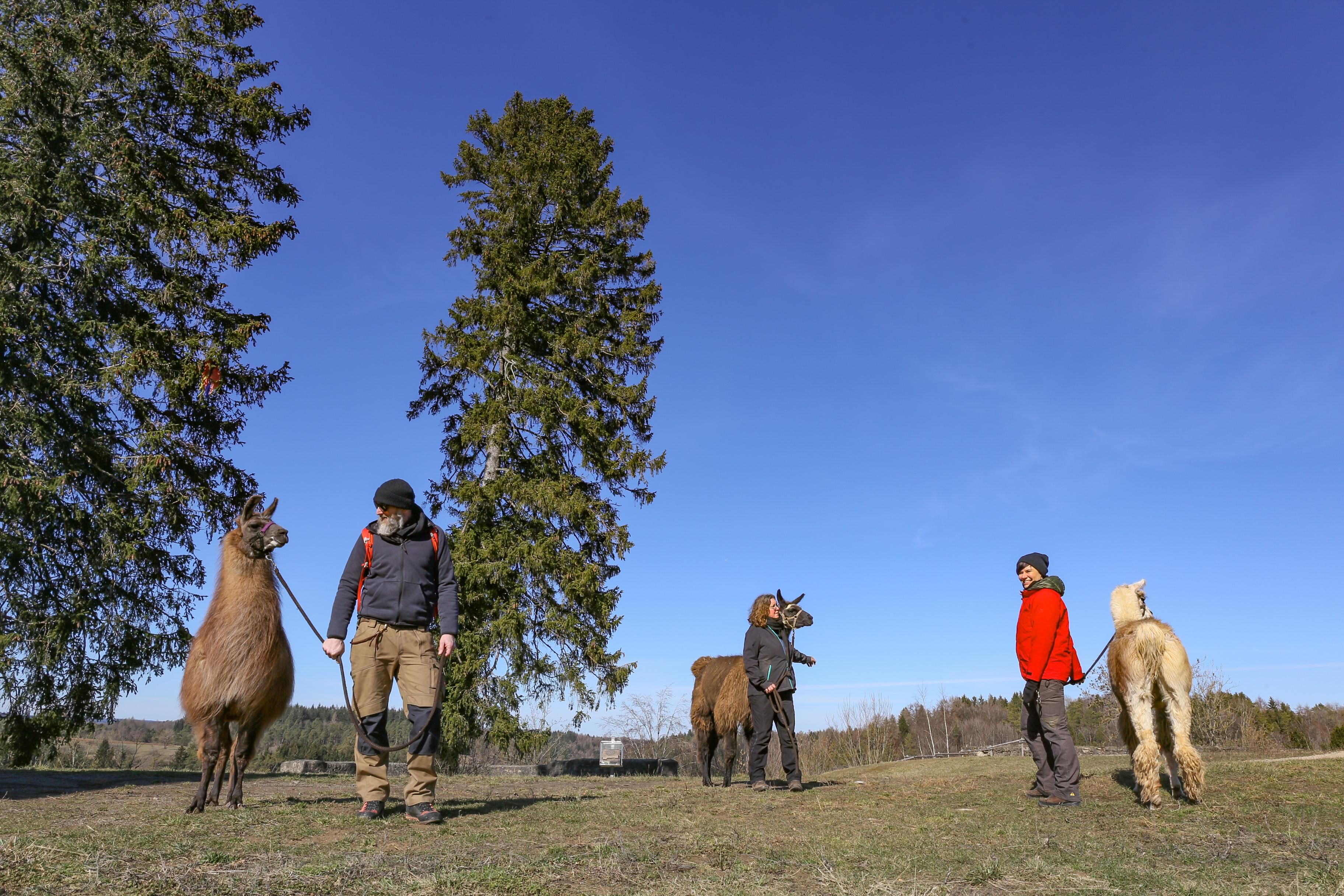 De alpaca's en lama's grazen op een boomgaard onder de ruïnes van kasteel Schönecken. Daar maken we op een ontspannen manier kennis met de dieren en leren we hoe we deze geduldige en nieuwsgierige dieren kunnen begeleiden. Daarna begint onze lama- en alpacawandeling in het natuurreservaat Schönecker Schweiz.