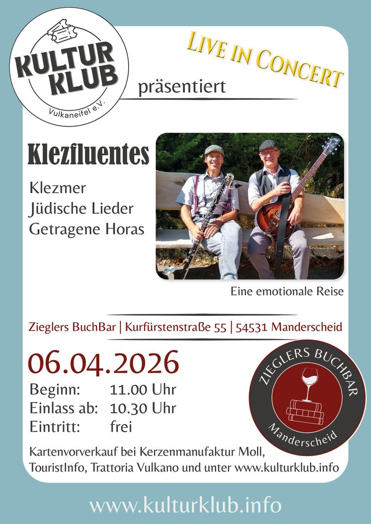 Minimalistische bezetting, groot spelplezier - zo presenteert Klezfluentes Klezmer en Joodse liederen. Langzame Horas raken de ziel en snelle Freilachs zetten aan tot dansen, wanneer de klarinetten en saxofonen van Thomas Peters klinken, gedragen door Greg Wolfs gitaar. De klarinet klinkt soms hoog en briljant, soms zacht en diep; de saxfoon vult de ruimte met volle klank, wanneer Klezfluentes de luisteraars meeneemt op een emotionele reis door de gevarieerde, traditionele Joodse muziek met zijn veelzijdige invloeden.