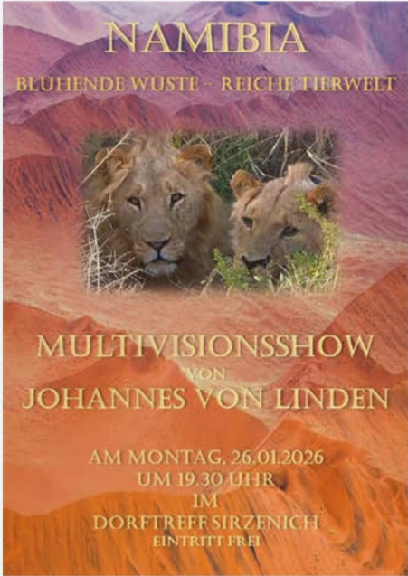 Multivisienshow Namibië in Dorptreff Sirzenich +++ 26 januari 2026 (maandag) +++ 19:30 uur