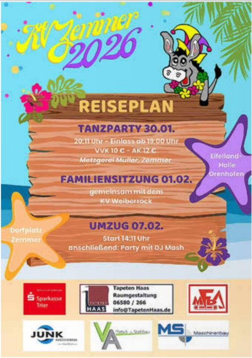 Vastenavond in Zemmer +++ Dansfeest in de Eifelland-Halle Orenhofen +++ 30 januari 2026 (vrijdag) +++ 20:11 uur+++ Familiebijeenkomst samen met de KV Weiberröck in de Eifelland-Halle Orenhofen +++ 01 februari 2026 (zondag) +++ Optocht in Zemmer (Start: dorpsplein) +++ 07 februari 2026 (zaterdag) +++ 14:11 uur