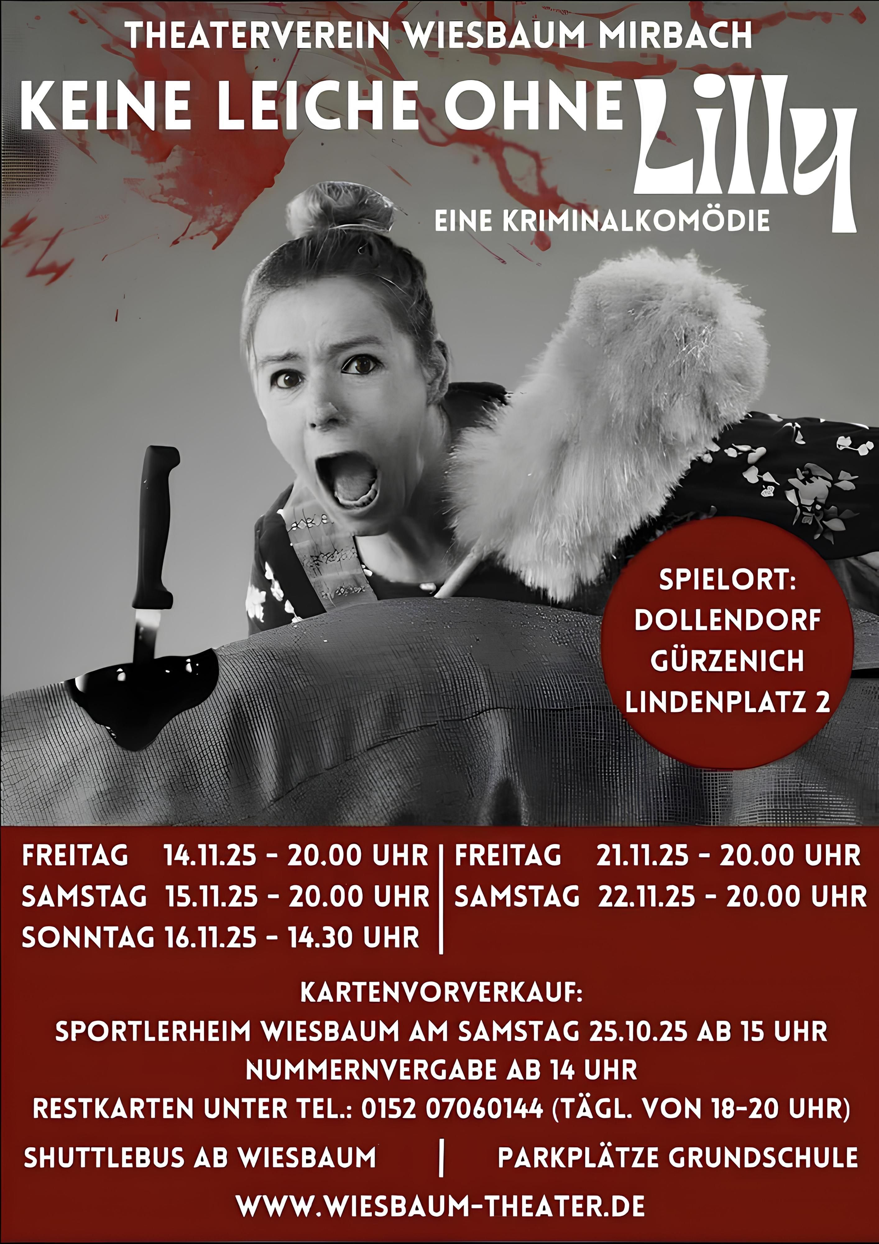 Kriminalkomedie van toneelvereniging Wiesbaum-Mirbach Kaartverkoop: Sportlerheim Wiesbaum op zaterdag, 25.10.2025 vanaf 15:00 uurNummernvergabe vanaf 14:00 uur Restkaartjes onder Tel.: 0152 070 60144 (dagelijks van 18 - 22:00 uur) Shuttlebus vanaf Wiesbaum - Parkeerplaatsen basisschool // Speelplek: Dollendorf, Gürzenich, Lindenplatz 2