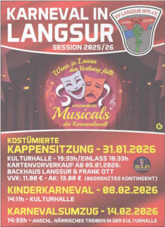 Carnaval in Langsur Sessie 2025/26+++ 31 januari 2026 (zaterdag) Geklede Kappensitzing in de Cultuurhal Langsur +++ 19:33 uur +++ 08 februari 2026 (zondag) Kinder Carnaval in de Cultuurhal +++ 14:11 uur+++ 14 februari 2026 (zaterdag) Carnavalstoet +++ 14:33 uur
