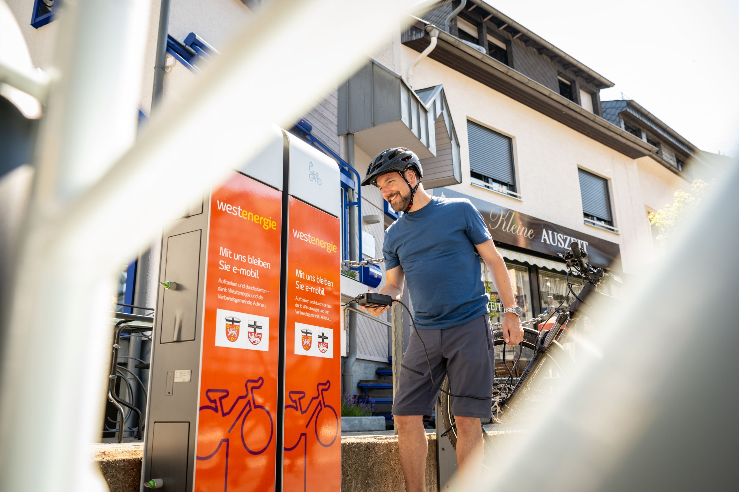 Het oplaadstation voor e-bikes direct bij het Rathaus Ulmen is het hele jaar beschikbaar.