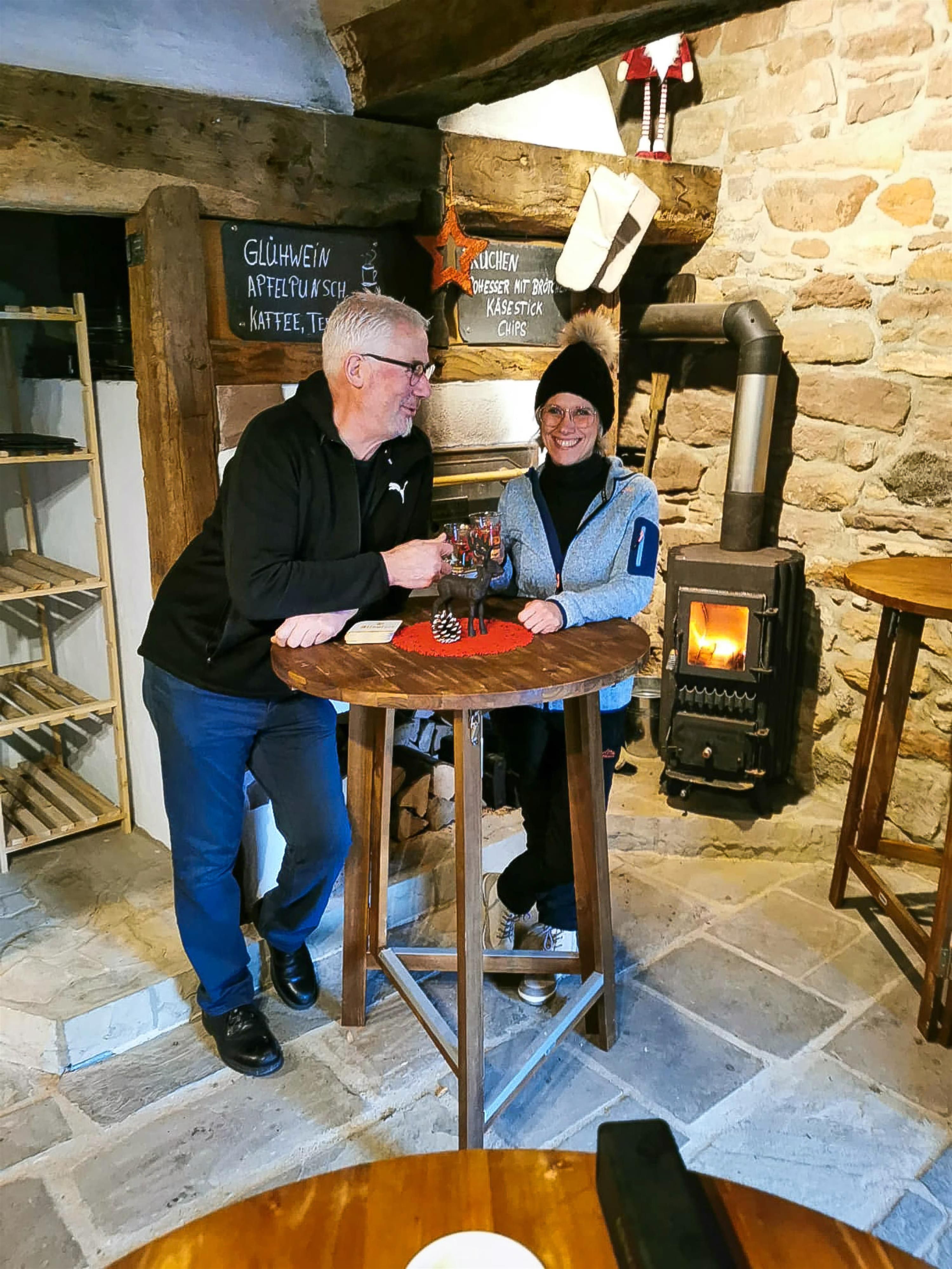 Wij zijn Anja en Rainer Schoos met onze kinderen Susanna en Sophia. We runnen ons kleine openluchtcafé als hobby en voor het plezier van echte Eifelse gastvrijheid. We zijn open in de zomer als het mooi weer is en in de winter als het glühweintijd is. Ons zorgvuldig geselecteerde, beperkte assortiment bestaat voornamelijk uit kwaliteitsproducten met een regionale focus, zoals gistgebak uit onze houtoven, koffiespecialiteiten, koude dranken, tapbier en seizoensgebonden snacks. We kijken ernaar uit om je als gast te verwelkomen.