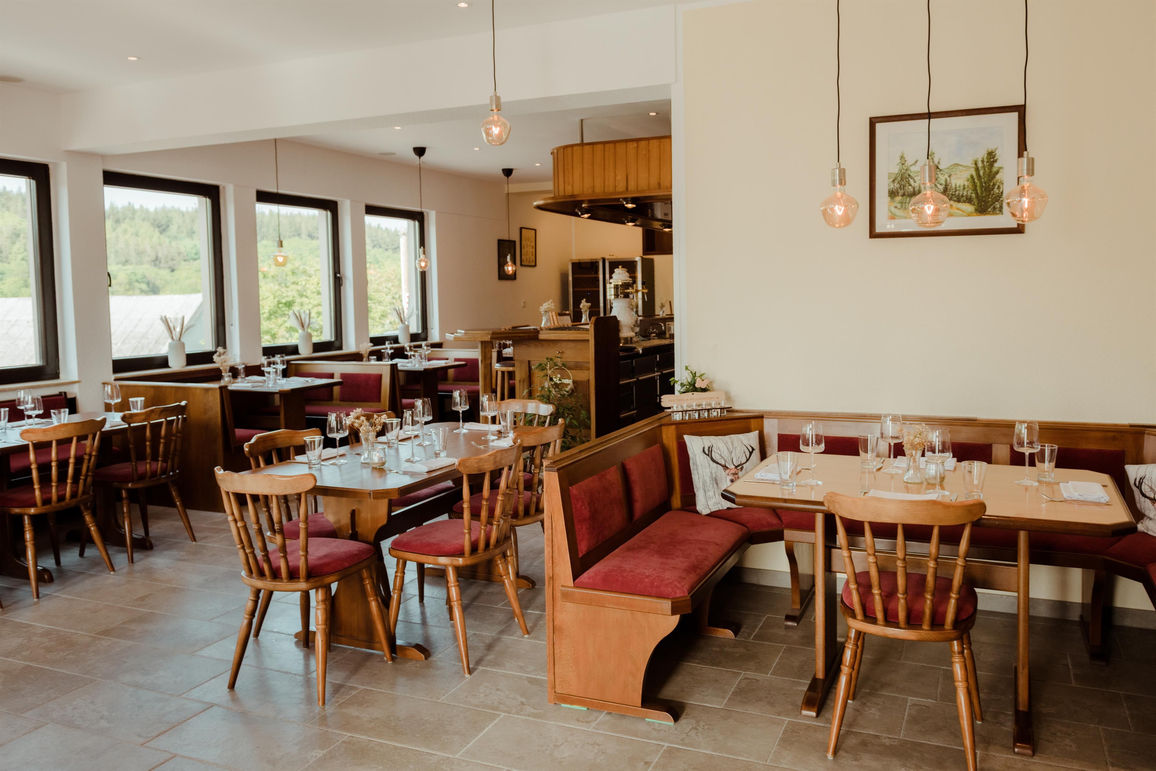 In ons familiebedrijf vind je de perfecte mix van culinaire specialiteiten uit de Eifel en de internationale keuken. We hechten veel waarde aan seizoensgebonden en regionale aanbiedingen. Wij willen onze gasten onze liefde voor de Eifel op een bord laten ervaren. De subtiliteit van de bereiding, de smaakvolle afstemming van de afzonderlijke componenten en de sfeer van een ontspannend uitstapje moeten zorgen voor tevredenheid tijdens uw bezoek aan ons restaurant, dat geheel in landhuisstijl is gehouden.