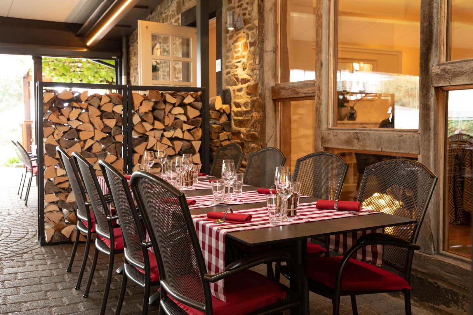 . De boerentuin ligt direct aan de middeleeuwse stadsmuur, naast een van de weinige overgebleven versterkte torens in Münstermaifeld, en dient tijdens de warmere maanden van het jaar als terras in het groen.