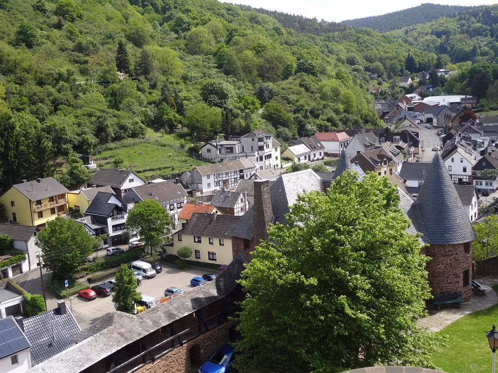 Parkeer op een van de aangegeven parkeerplaatsen en volg de borden naar het kasteel en de Eifel-Blick. Er is een parkeerplaats in de directe omgeving van de Eifel-Blick, op slechts ongeveer 50 meter van het uitkijkpunt.