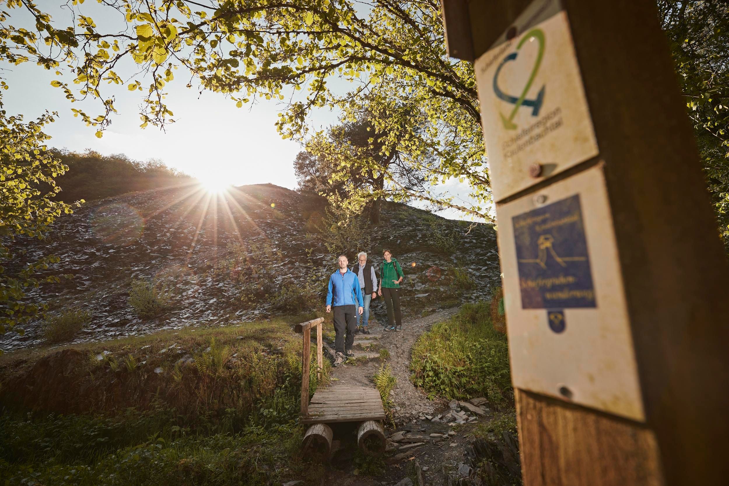 De geleide wandeling “Hemel en Aarde” brengt de geschiedenis dichtbij. Van de “aarde”, de vroegere mijnbouw van leisteen gaat het naar de “hemel “,de indrukwekkende bedevaartskerk Maria Martental die reeds door talrijke pelgrims bezocht werd. Ook voor eten en drinken zijn er voorzieningen, wie het wenst kan zich na de afwisselende wandeling in een eetgelegenheid laten verwennen met een “leisteen-wijn” en regionale specialiteiten. De geleide groepswandeling gebeurt onder begeleiding van iemand van de vereniging voor het behoud van de geschiedenis van de mijnbouw van leisteen. Ze begint in Müllenbach aan het cultuurcentrum, loopt langs een landschappelijk waardevolle weg waarlangs oude leisteengroeven, mijngangen, resten van gebouwen en zuilengangen te vinden zijn en gaat tot de steile leistenen wand in het Kaulenbachdal.