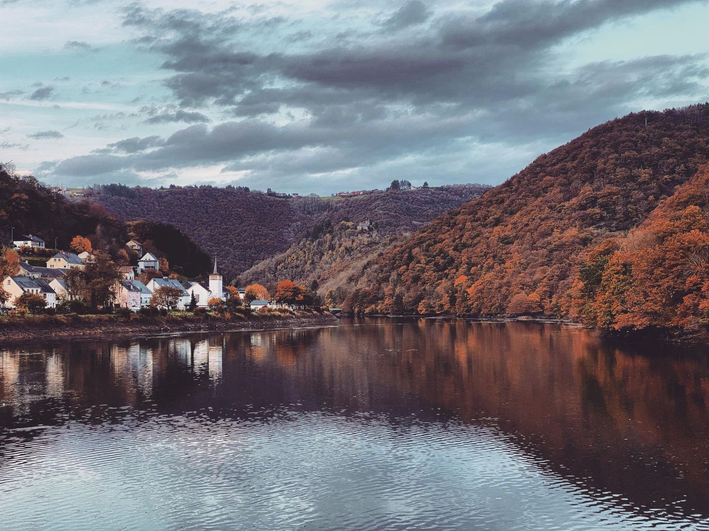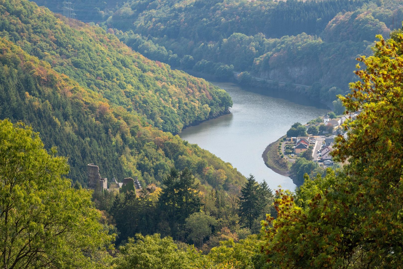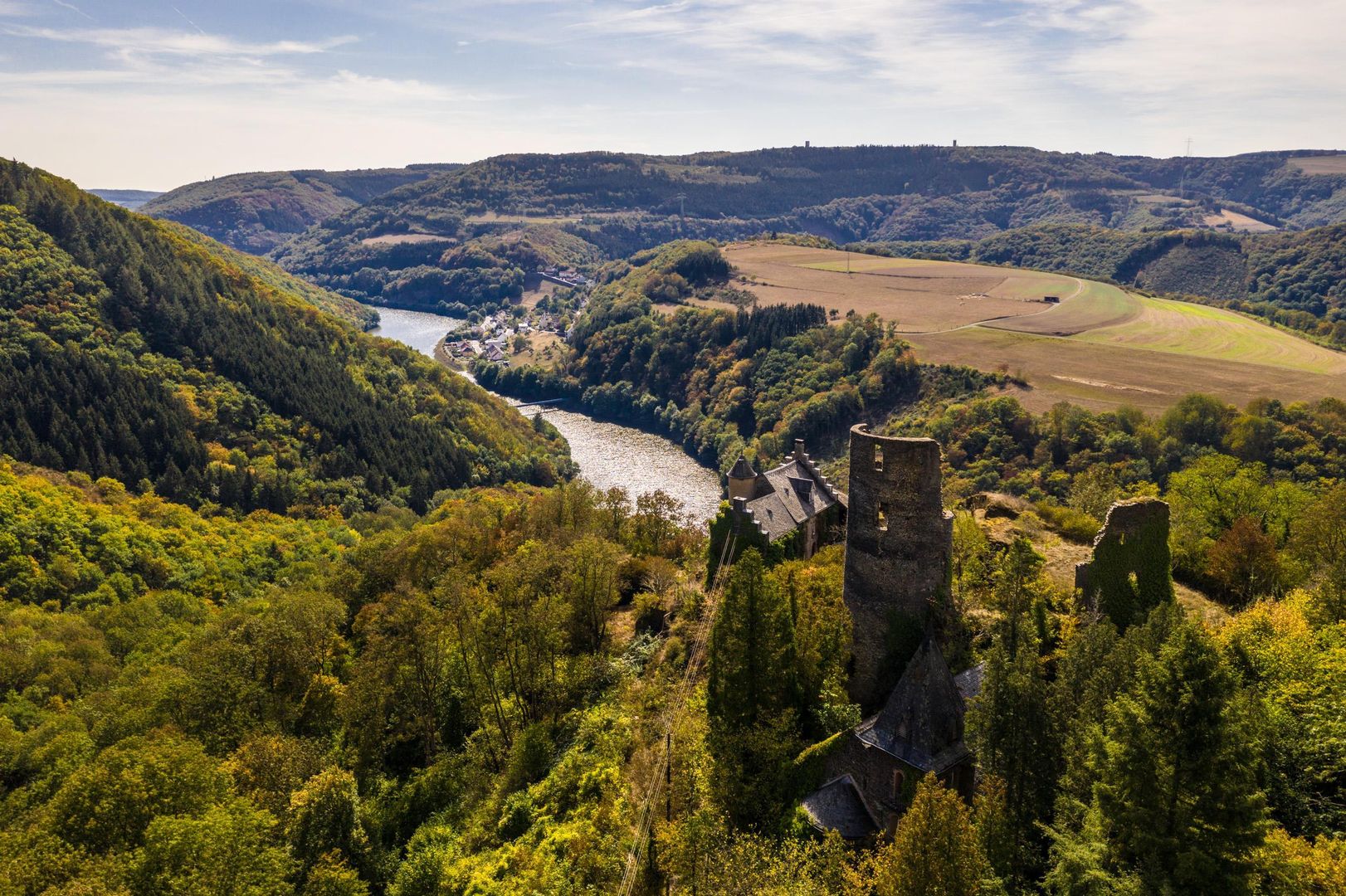 De ruïnes van kasteel Falkenstein verheffen zich op een steile bergrug hoog boven de Ourvallei. Onder het kasteel kronkelt de Our in een opvallende bocht en vormt zo de grens met het Groothertogdom Luxemburg.