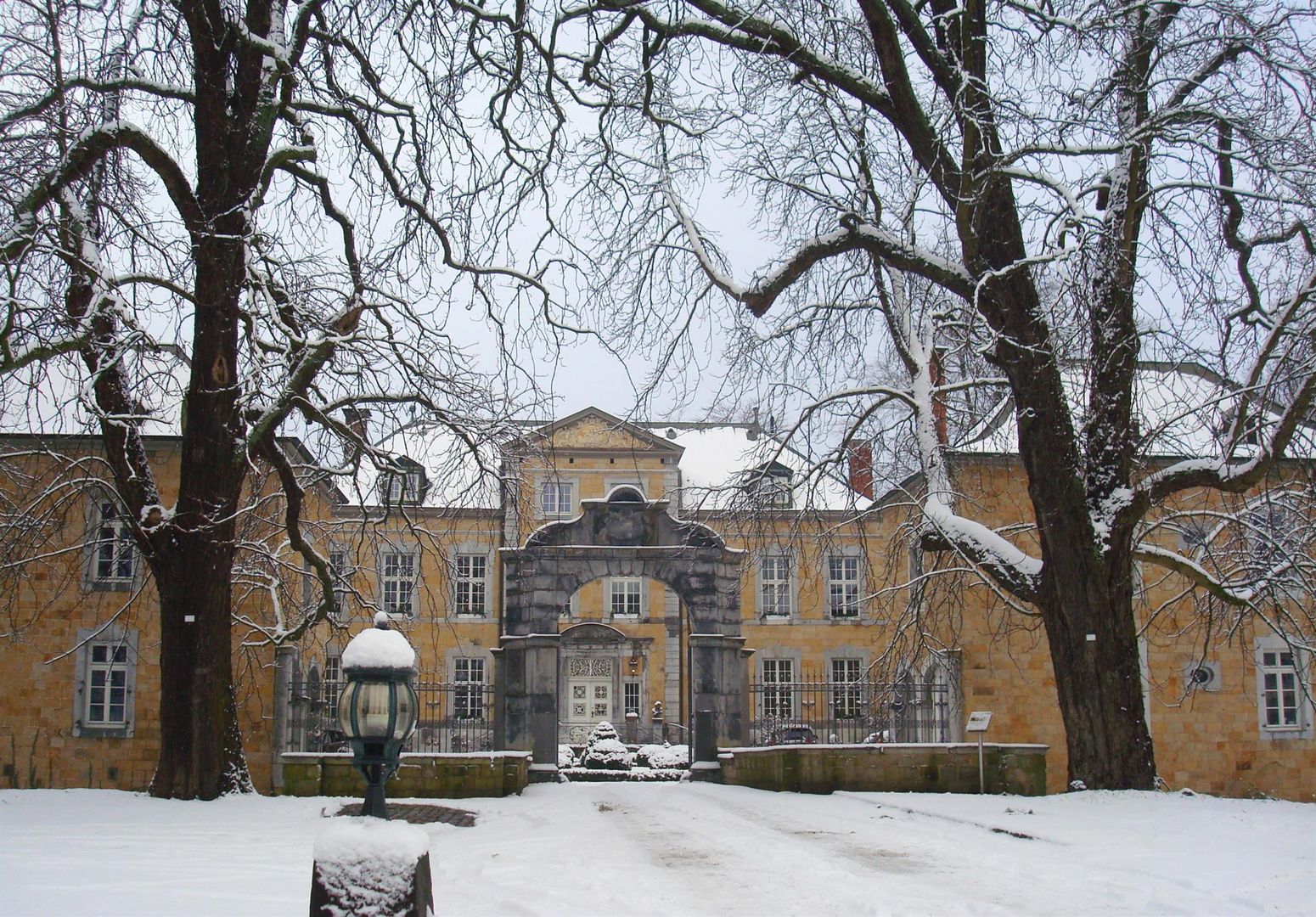In tegenstelling tot alle andere koperen binnenplaatsen is het hoofdgebouw bekleed met kalkmergelstenen platen, waarbij de gevelgeleding (vensteromlijstingen en afwerkranden van het metselwerk) wordt benadrukt door het gebruik van plaatselijke blauwe hardsteen. Niet alleen de delicate gele kleur van het kalkmergelfineer, maar ook de algemene vormgeving van het gebouw geven het complex de aanblik van een klein kasteel op het platteland.