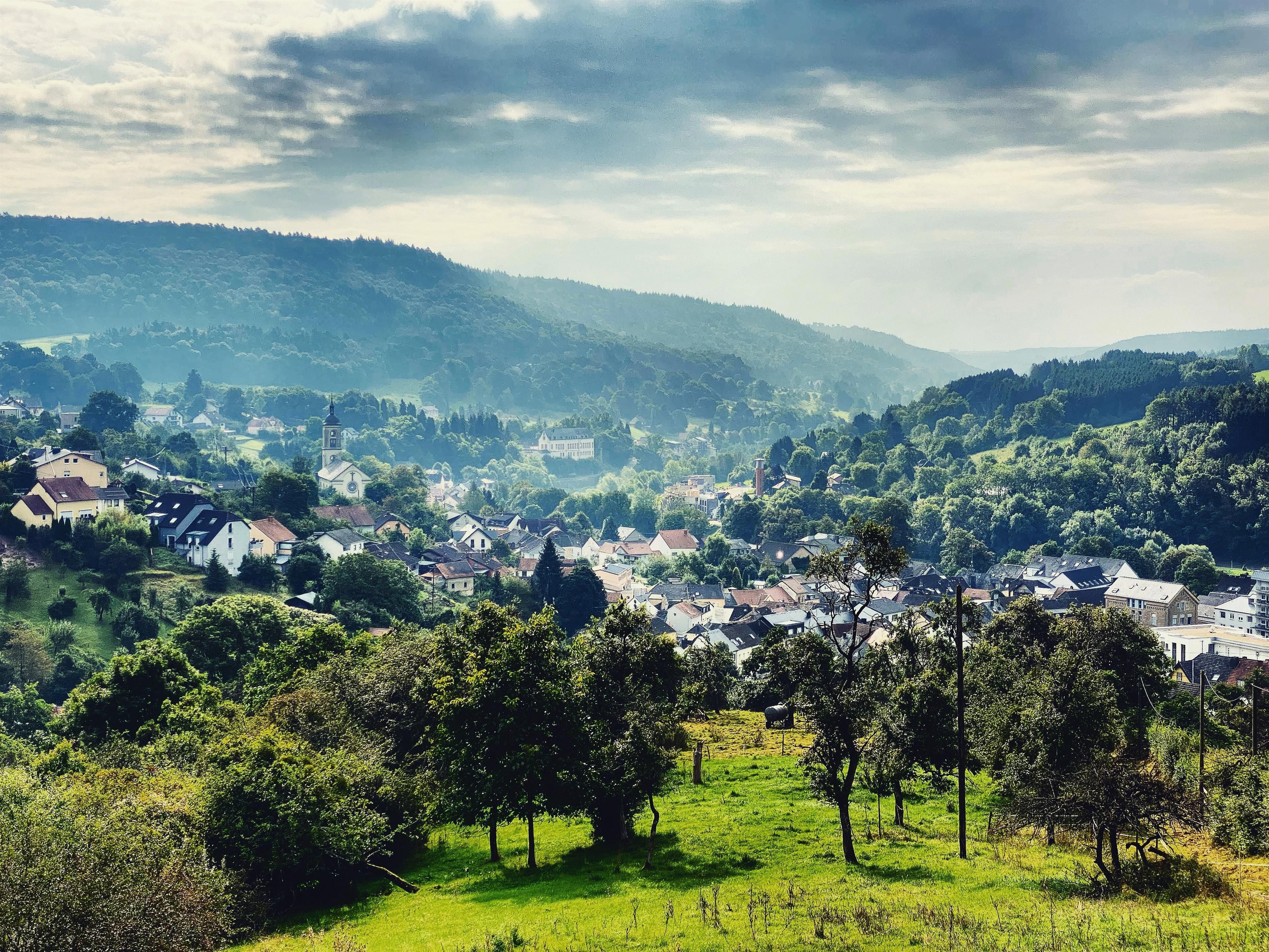 Het Mariabeeld met lichtkrans, gemaakt van Bollendorf zandsteen, staat op een vijf meter hoge zuil hoog boven het dorp.