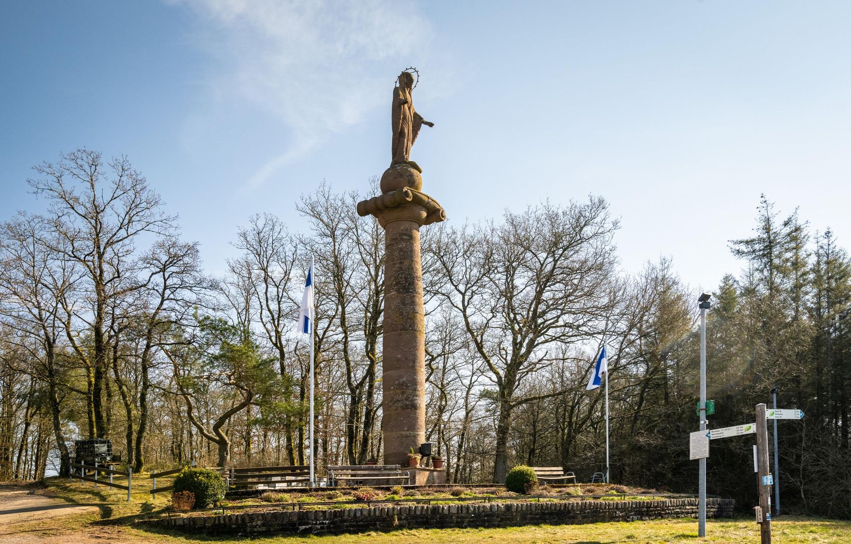 De benodigde zandsteenblokken komen uit de steengroeven Neidenbach. De 13 ronde blokken en het beeld werden met paard en wagen naar Eichelsberg vervoerd. De twee zware basisstenen wogen elk ongeveer 3,3 ton. Om de kolom op te zetten, werd een steiger geplaatst bestaande uit zes stammen van meer dan 20 meter hoog waarop een katrol werd bevestigd. Het duurde 20 maanden voordat dit voorbeeldige gemeenschapswerk van de bevolking kon worden voltooid. Op 9 mei 1948, de dag van de wijding van de kerk en de seculiere overdracht van het monument aan de katholieke parochie Waxweiler, maakten honderden mensen een plechtige processie op de Eichelsberg.
