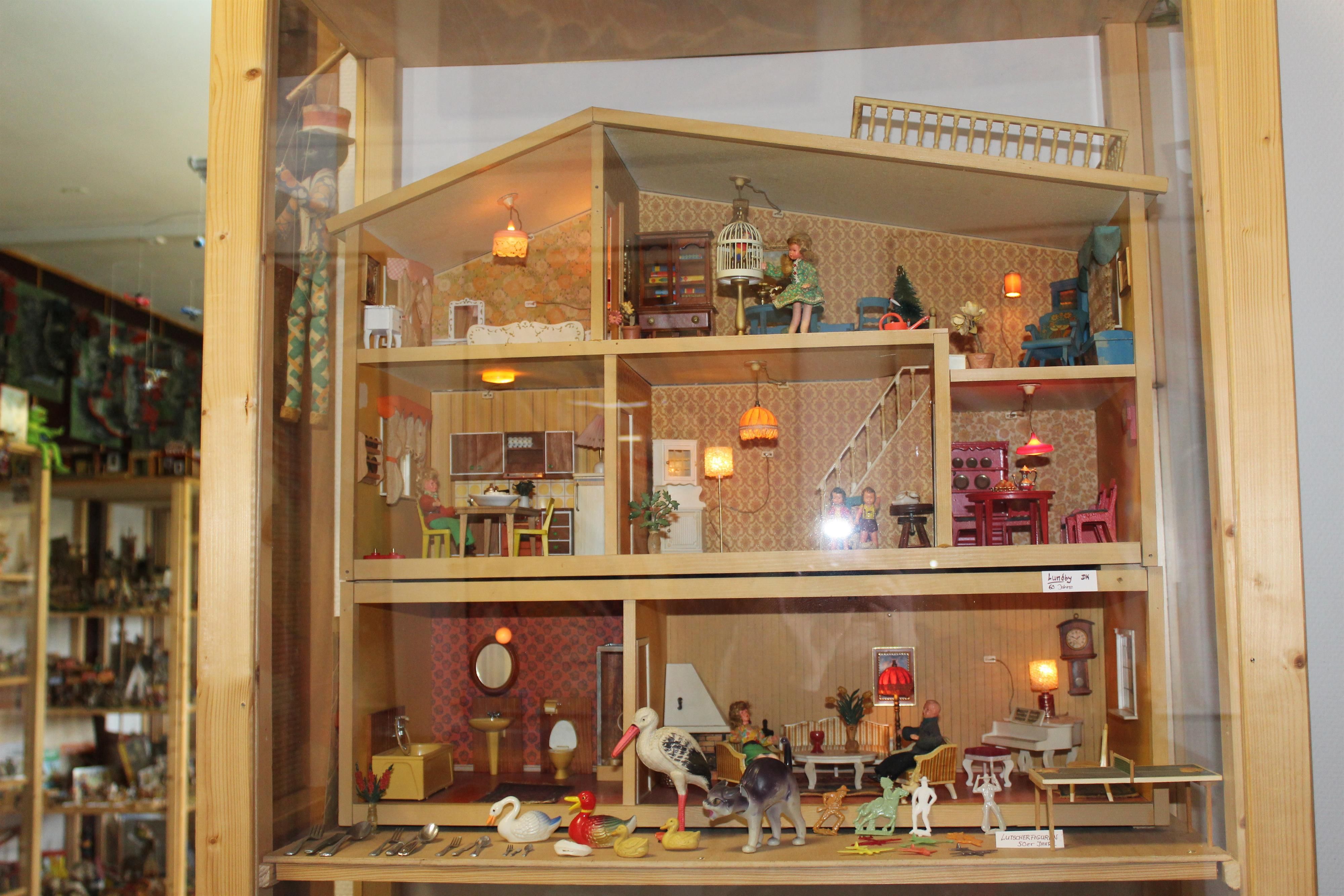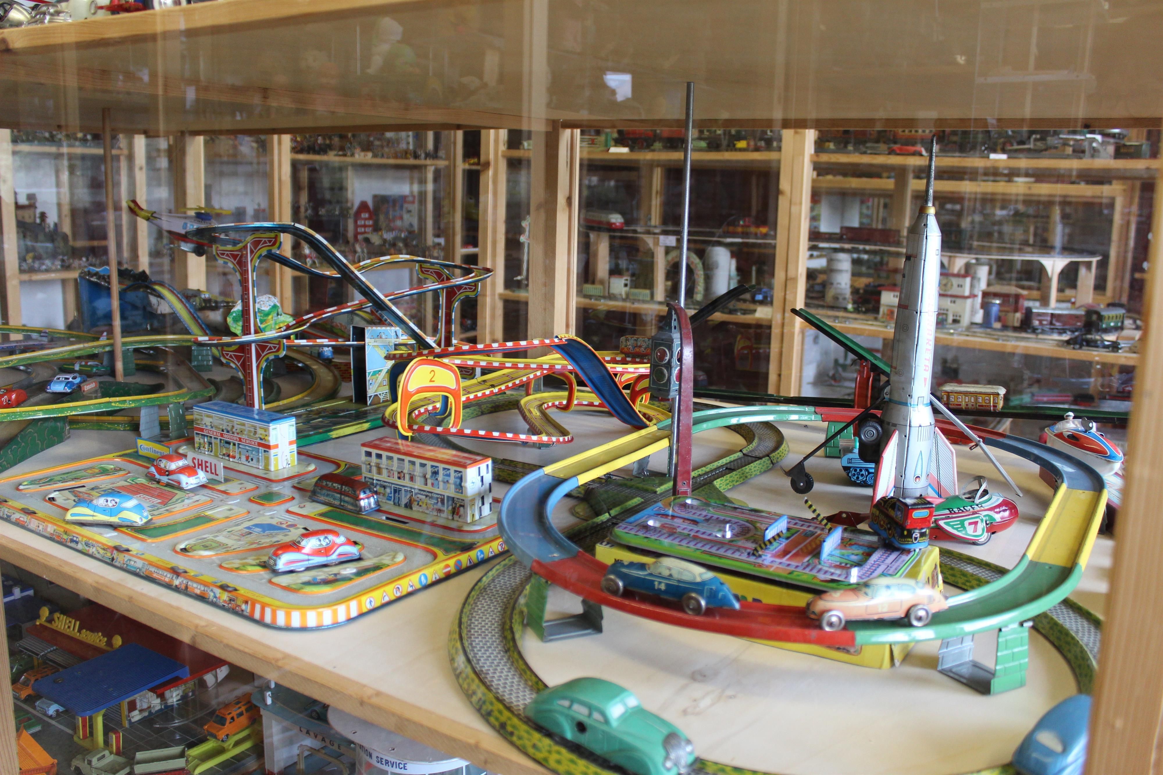 vele jaren en veel liefdevol gerestaureerd. De nadruk ligt op mechanisch speelgoed en opwindfiguren, slot-car modellen, waarvan sommige zelfgemaakt, evenals ridderkastelen, ridder- en indianenfiguren en dieren van klei en plastic. Er zijn ook spoorwegen, autowegen, blikken speelgoed, naaimachines en bordspellen te vinden, zodat sommige bezoekers zich terug in hun kindertijd voelen.