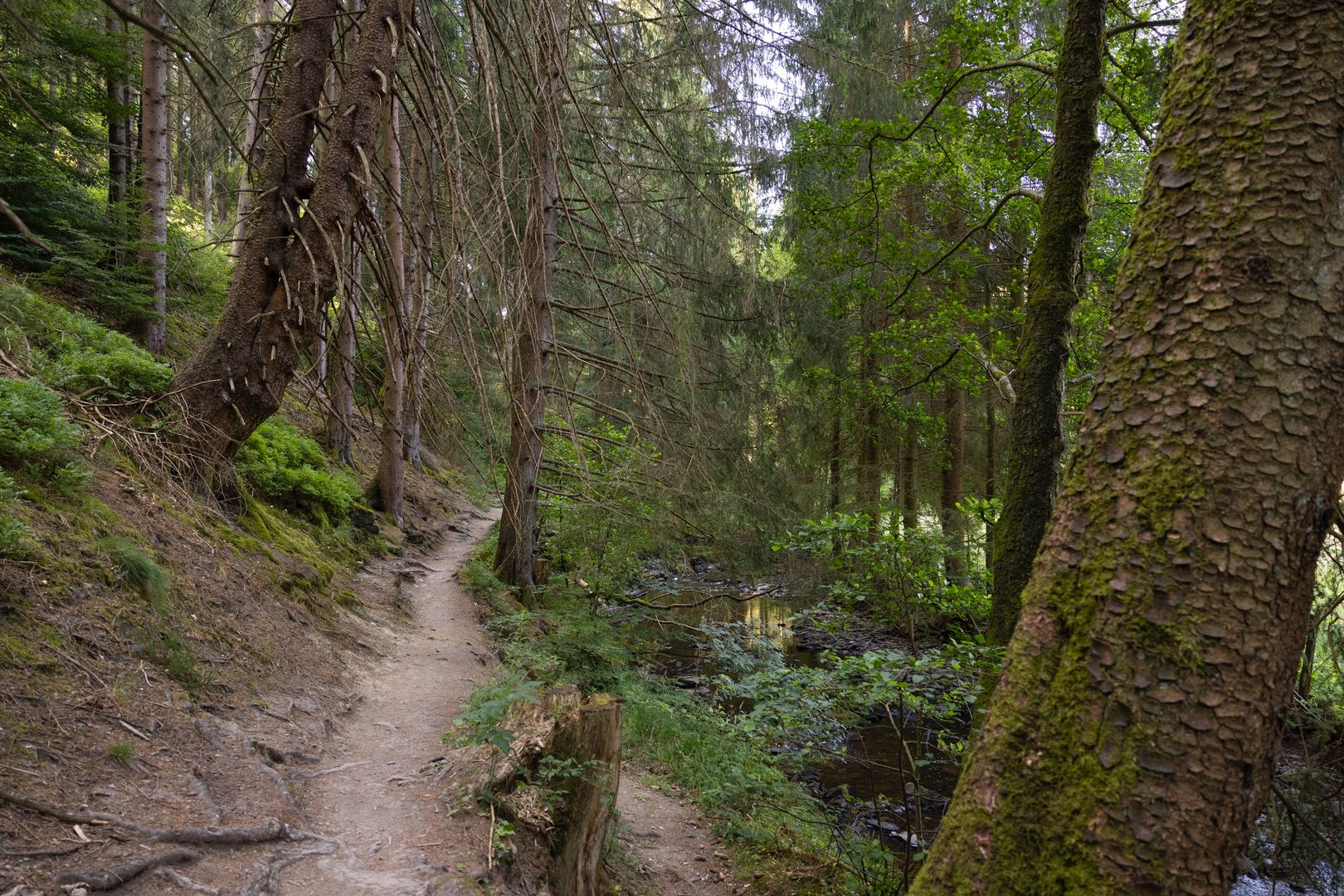 Als je goed geïnformeerd bent, kun je beginnen met een ontspannen wandeling van een halve dag op de Wilderness Trail* net achter de poort van het Nationalpark. Eerst gaat het pad bergafwaarts langs machtige heggen in de richting van de stuwdam van Perlenbach. Als je geluk hebt, kun je buizerds en haviken over het open land zien vliegen. Later volg je het Wildcat-logo op de wegwijzer naar links en kom je bij een geweldig wortelpad door een dicht sparrenbos. Hier is niet alleen een picknickplaats, maar ook een interessant wortelpad waar je je achter de bomen aan de rand van het pad kunt verstoppen. Je hoort de Perlbach bijna de hele tijd voorbij kabbelen. Bij de brug naar het Holländerhäuschen gaat de wildweg naar links en volg je het Fuhrtsbachtal tot aan de Antoniusbrücke. Het dal maakt deel uit van een natuurreservaat en is, net als het naburige Perlenbachtal, beroemd om de miljoenen wilde narcissen die in het voorjaar bloeien. Daarna gaat de route verder over bos- en wandelpaden, steeds de wilde kat volgend in de richting van de wandelparkeerplaats Wahlerscheid, met 632 meter het hoogste punt van de Wildernisweg. Afhankelijk van de tijd van het jaar kun je geurende wilde kruiden ruiken en vlinders observeren in de romantische weidedalen.