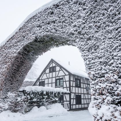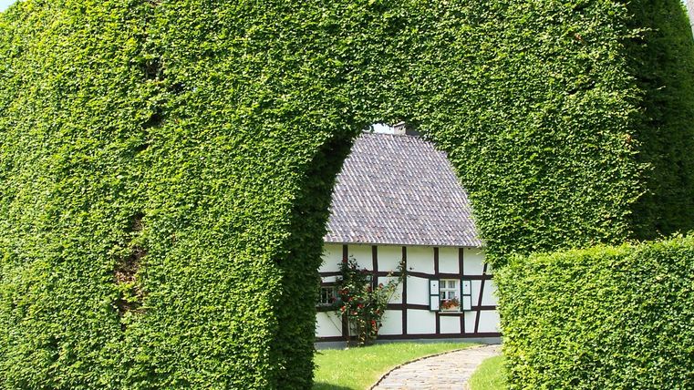 En dan gaat het naar de Weiherstraße. We verbazen ons over de indrukwekkende beukenhagen, waarvan sommige wel 6 meter hoog, 1 meter diep en wel 30 meter lang zijn. We kunnen goed begrijpen dat de hagen de gebouwen beschermen tegen wind, regen en sneeuw, want de huizen en tuinen zijn nauwelijks zichtbaar vanaf het pad. En terwijl we ons nog steeds afvragen hoe zulke heggen onderhouden en gesnoeid worden, zien we de grote bogen voor de ingangen van de binnenplaatsen en echte raamopeningen om de huizen erachter van licht te voorzien.