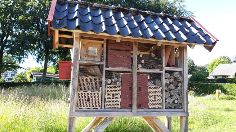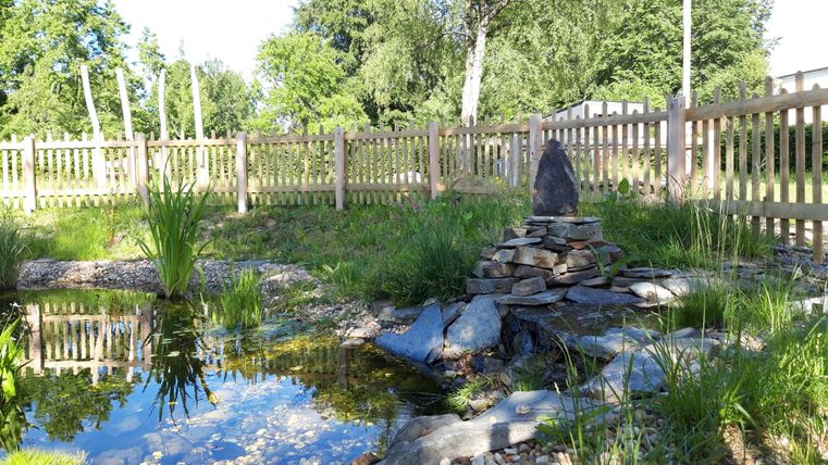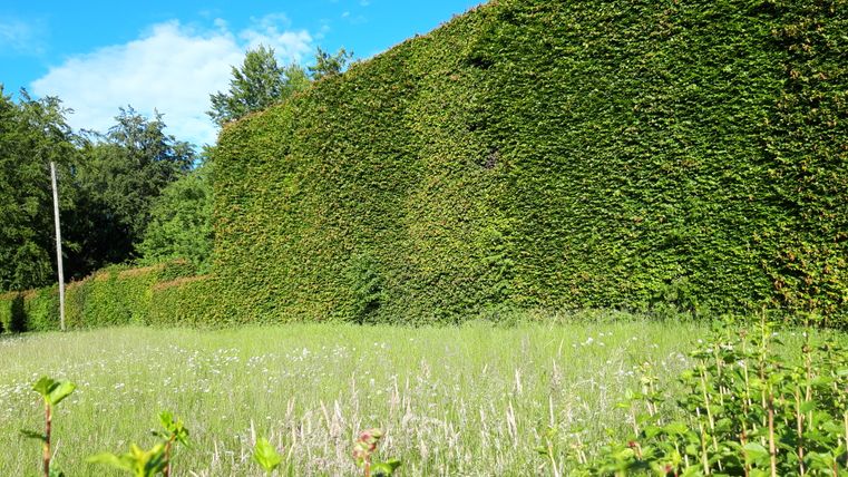 Direct aan het begin van het heggenpad, tegenover de poort van het nationale park, ontdekken we de dorpsbiotoop met zijn prachtige picknickplaats. Natuurlijk omsloten door beukenhagen is hier een kleine natuurlijke oase ontstaan die onze nieuwsgierigheid wekt. Het insectenhotel, de wilde bloemen, kruiden en het kabbelende beekje; we besluiten spontaan om een koffiepauze te nemen van onze rugzakken om alles in ons op te nemen.